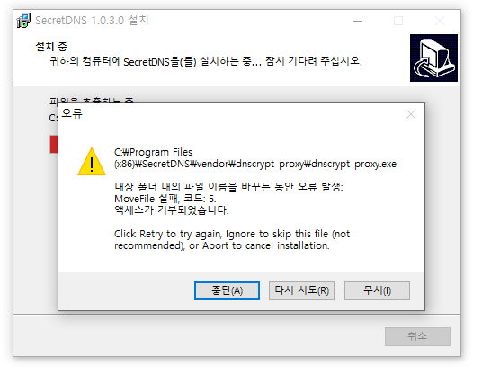 검색 목록 DNS 신버전 설치가 이상한데요? psp8200 쪽지보내기메일보내기자기소개아이디로 검색전체게시물 06-22 4 건 엑세스 거부하는데 어떻게 하죠? 검색 목록 오길호 쪽지보내기메일보내기자기소개아이디로 검색전체게시물 재부팅 후 다시 실행해 주시겠습니까? 또는, 시크릿DNS 에서 실행 중지하신 후 실행하시면 됩니다. (혹시 사용하시는 백신이 있다면 알려주시면 확인해보겠습니다.) 20-06-22 재부팅 후 다시 실행해 주시겠습니까? 또는, 시크릿DNS 에서 실행 중지하신 후 실행하시면 됩니다. (혹시 사용하시는 백신이 있다면 알려주시면 확인해보겠습니다.) psp8200 쪽지보내기메일보내기자기소개아이디로 검색전체게시물 Avira 쓰고있습니다 20-06-22 Avira 쓰고있습니다 psp8200 쪽지보내기메일보내기자기소개아이디로 검색전체게시물 실시간 감지 끄고 설치하니까 됩니다 20-06-22 실시간 감지 끄고 설치하니까 됩니다 오길호 쪽지보내기메일보내기자기소개아이디로 검색전체게시물 네. 오진이 많은 백신들은 프로그램이 화이트리스트로 등록되기 전엔 실행을 방지하는 것으로 보입니다. 불편함을 드려 죄송합니다 ㅠ 20-06-23 네. 오진이 많은 백신들은 프로그램이 화이트리스트로 등록되기 전엔 실행을 방지하는 것으로 보입니다. 불편함을 드려 죄송합니다 ㅠ 로그인 후 댓글내용을 입력해주세요 댓글 * 제목 글쓴이 날짜 시크릿 dns 고장난거 같은데요? 1 psp8200 쪽지보내기메일보내기자기소개아이디로 검색전체게시물 1 21-06-13 psp8200 쪽지보내기메일보내기자기소개아이디로 검색전체게시물 21-06-13 ⭐ DNS 신버전 설치가 이상한데요? 4 psp8200 쪽지보내기메일보내기자기소개아이디로 검색전체게시물 4 20-06-22 psp8200 쪽지보내기메일보내기자기소개아이디로 검색전체게시물 20-06-22 검색 목록 검색어 입력 제목 내용 제목+내용 아이디 아이디(코) 글쓴이 글쓴이(코)