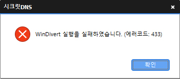 433 인 경우 WinDivert 가 종료중일때 나타나는 오류인데 혹시 비슷한 프로그램(GoodbyeDPI 등)이라던지 Cloudflare WARP 등이 설치되어 있나요? WinDivert 를 사용하는 다른 프로그램과 충돌이 나고 있는게 아닌지 의심이 됩니다.- 22-02-22