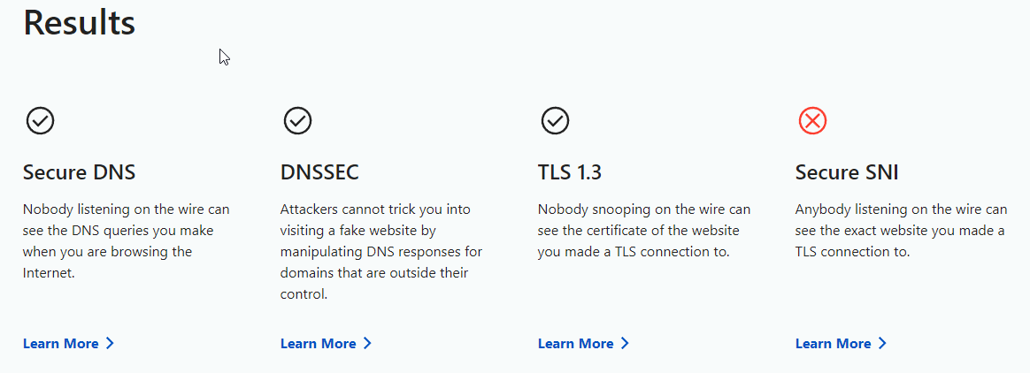 Cloudflare ESNI체크 해보면 DOH는 설정이 되어 있는데 SNI는 암호화 되지 않았다고 나옵니다.
