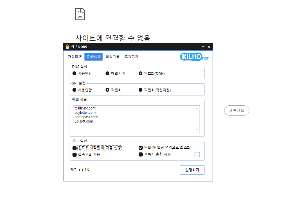 시크릿DNS 환경설정에서 암호화로 설정하고 실행하면 인터넷이 되긴 하지만 다른 옵션이나 프로그램을 종료하거나 실행하지 않으면 인터넷 연결이 끊겨버립니다. DNS설정이 뭔가 바뀐거 같은데 어떻게 해야 하나요?