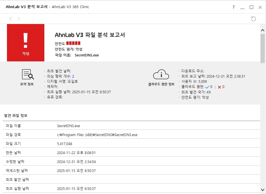 안녕하세요. 시크릿DNS가 V3 백신에서 악성코드로 인식이 됩니다.