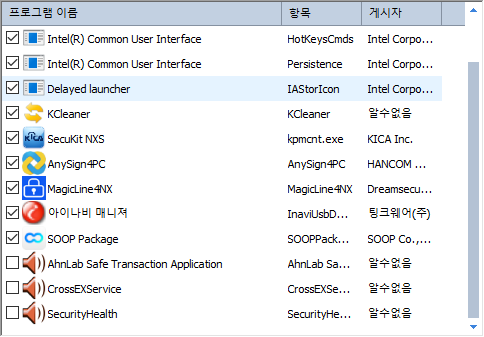 윈도우클리너 자동실행 목룍에서 crossex service securityhealthsystray ahnlab safe transaction 사운드 드라이버 아이콘 나옵니다 오류를 수정부탁드립니다.