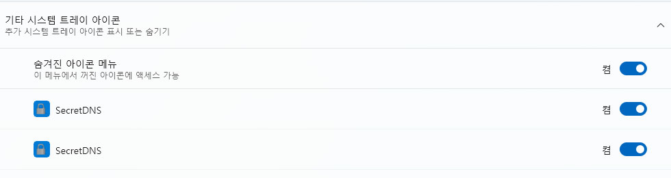 시크릿DNS 업데이트 할때마다 트레이 아이콘 설정에 계속 아이콘이 늘어납니다.