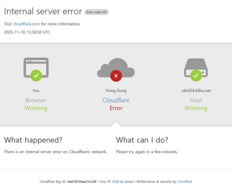 SecretDNS 다운로드는 Cloudflare R2를 통해 제공되고 있는데, 한국 시각 기준 오늘 오후 8시 40분경 Cloudflare 측 장애가 발생한 것으로 확인되었습니다. 이 문제로 인해 다운로드 페이지에 Internal Server Error가 표시되며 다운로드가 되지 않았던 것으로 보입니다.