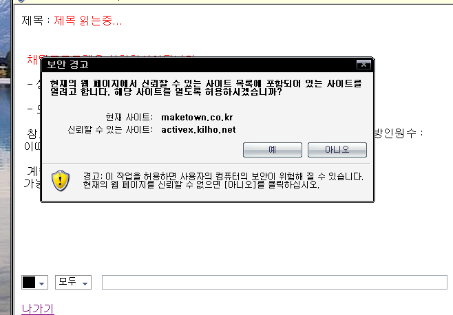 현재 NOD32 백신 프로그램을 쓰고 있습니다. 길호쳇을 TEST하는 중 active-X 관련하여 어려움을 겪고 있습니다. test 환경에서도 안되는 상황에 웹환경에서 사용자가 active-X설치에 어려움이 있다면, 그 site에 방문한 사람은 쉽게 포기할 것 입니다. active-X를 어떻게 고쳐야 할 것 같습니다.