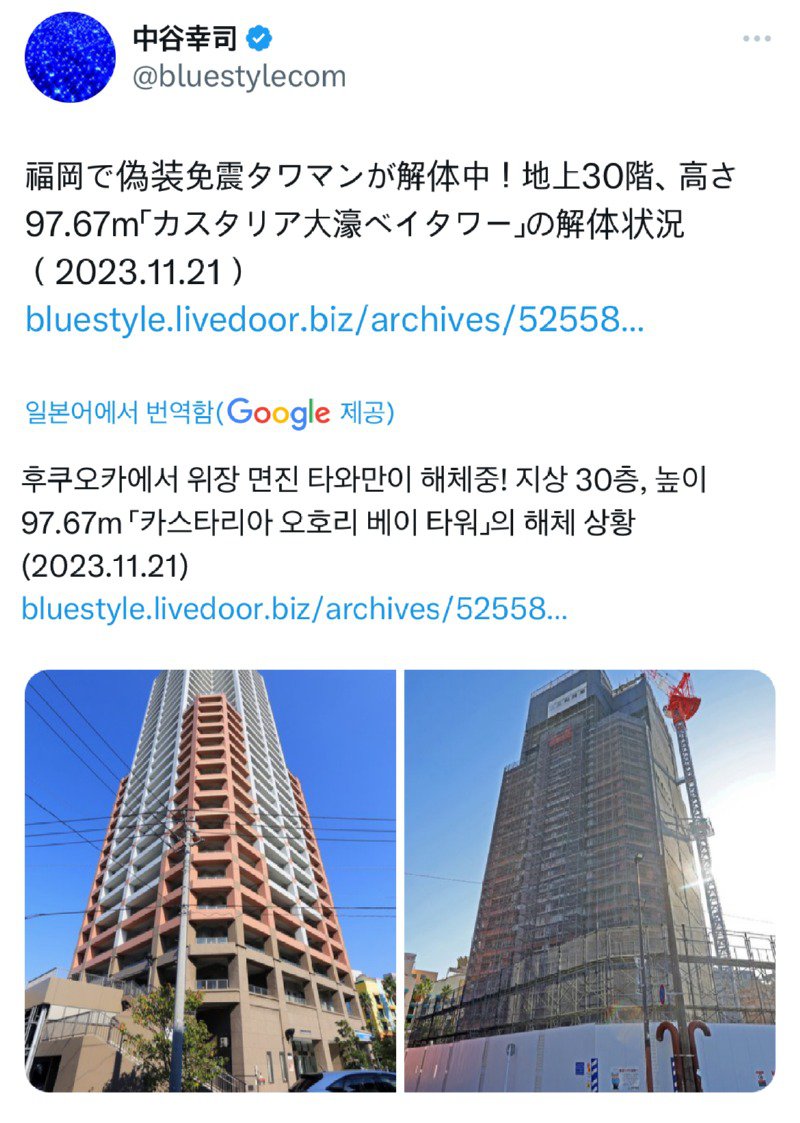 글의 요지는 후쿠오카에서 위장 면진 타와만이 현재 해체 중이라는 것입니다. 이 건물은 지상 30층이며 높이는 97.67m입니다. 따라서 이 해체 작업은 2023년 11월 21일에 진행되었습니다. 그리고 일부 기둥에서는 띠철근이 절반 누락되어 있는 상황이라고 합니다. 이에 대해 대형 건설사는 전면 재시공을 요청하고 있으며, 대우건설은 무리한 금액으로 인수를 요구하고 있어 상황이 복잡해지고 있다고 합니다. 또한, 이 재건설 작업은 주요 인프라의 안전을 고려하여 교통안전과 보행자안전에 있어 각별한 주의가 필요하다는 점을 강조하고 있습니다.