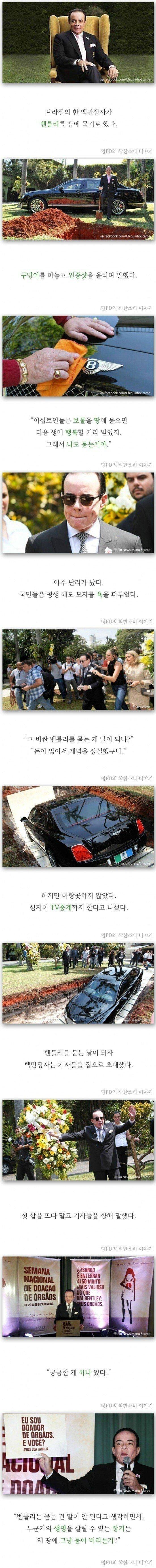 한 백만장자가 벤틀리를 땅에 묻기로 결정했다. 그는 구덩이를 파놓고 인증 사진을 찍으며 말했다. 이집트인들은 보물을 땅에 묻으면 다음 생에 행복할 것이라 믿는다고 말했다. 이 일로 국민들은 백만장자에게 비난의 폭풍을 퍼부었다. 그러나 그는 아랑곳하지 않았다. 벤틀리를 묻는 행동은 말이 되지 않는다는 이야기도 있었다. 하지만 그는 사회적 반응을 무시하고 계속 진행했다. 첫 삽을 뜨기 전에도 아랑곳하지 않고 기자들에게 독설을 퍼부었다. 하지만 궁금한 점이 하나 있어서 기자들을 초대했다. 앱순의 기사에 따르면 벤틀리보다 더 값진 것, 즉 우리의 장기를 묻는 것은 말이 되지 않는다고 했다. 이 일로 백만장자는 국민들의 비난을 받고 나섰다. 최종적으로 벤틀리를 묻기로 한 일은 많은 논란을 일으켰다.