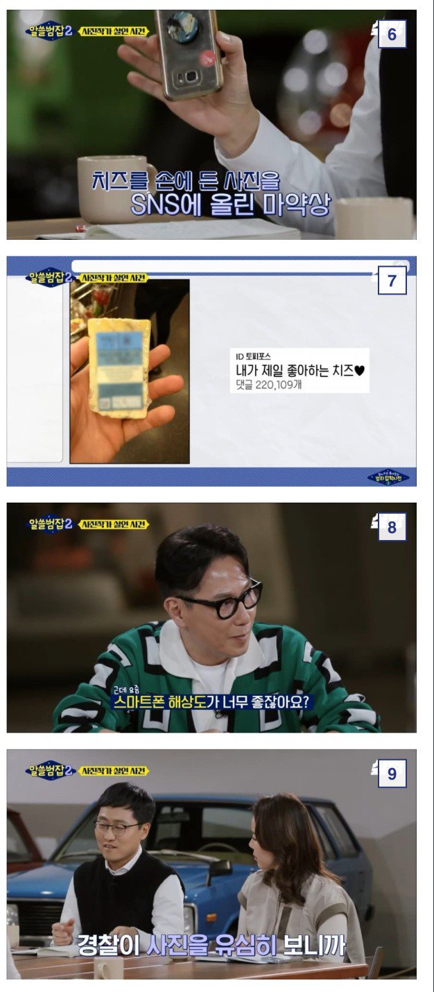 경찰은 다양한 방법을 시도해보았지만, 잡히지 않아 여러모로 고민하고 있다. 그 중 하나는 알쓸범집 사진작가 살인사건과 관련된 사진을 소셜미디어에 올리는 것이다. 마침손에 치즈를 든 사진이 있었고, 이를 통해 숨은 지문이 발견되었다.