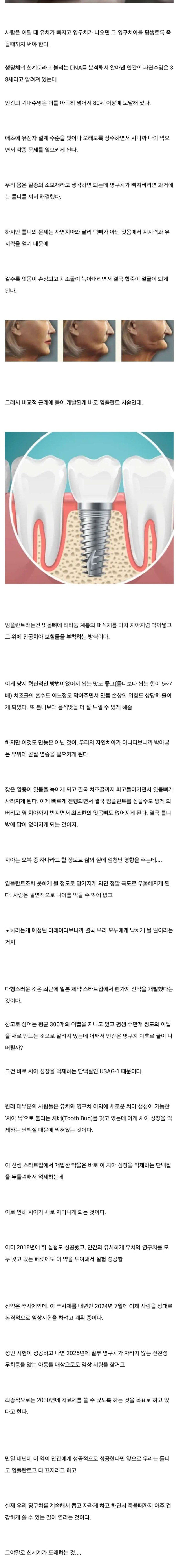 치아는 오복 중 하나라고 할 정도로 삶의 질에 엄청난 영향을 주는데.... 임플란트조차 못하게 될 정도로 망가지게 되면 정말 극도로 우울해지게 된 다. 사 람 필연적으로 나이를 먹을 수 밖에 없고 은 노 거 만능은 아닌 것이, 우리의 자연치아가 아니다보니까 박아넣 것도 예정된 미래이다보니까 결국 우리 모두에게 닥치게 될 일이라는 화라는게 지 다행스러운 것은 최근에 일본 제약 스타트업에서 한가지 신약을 개발했다는"