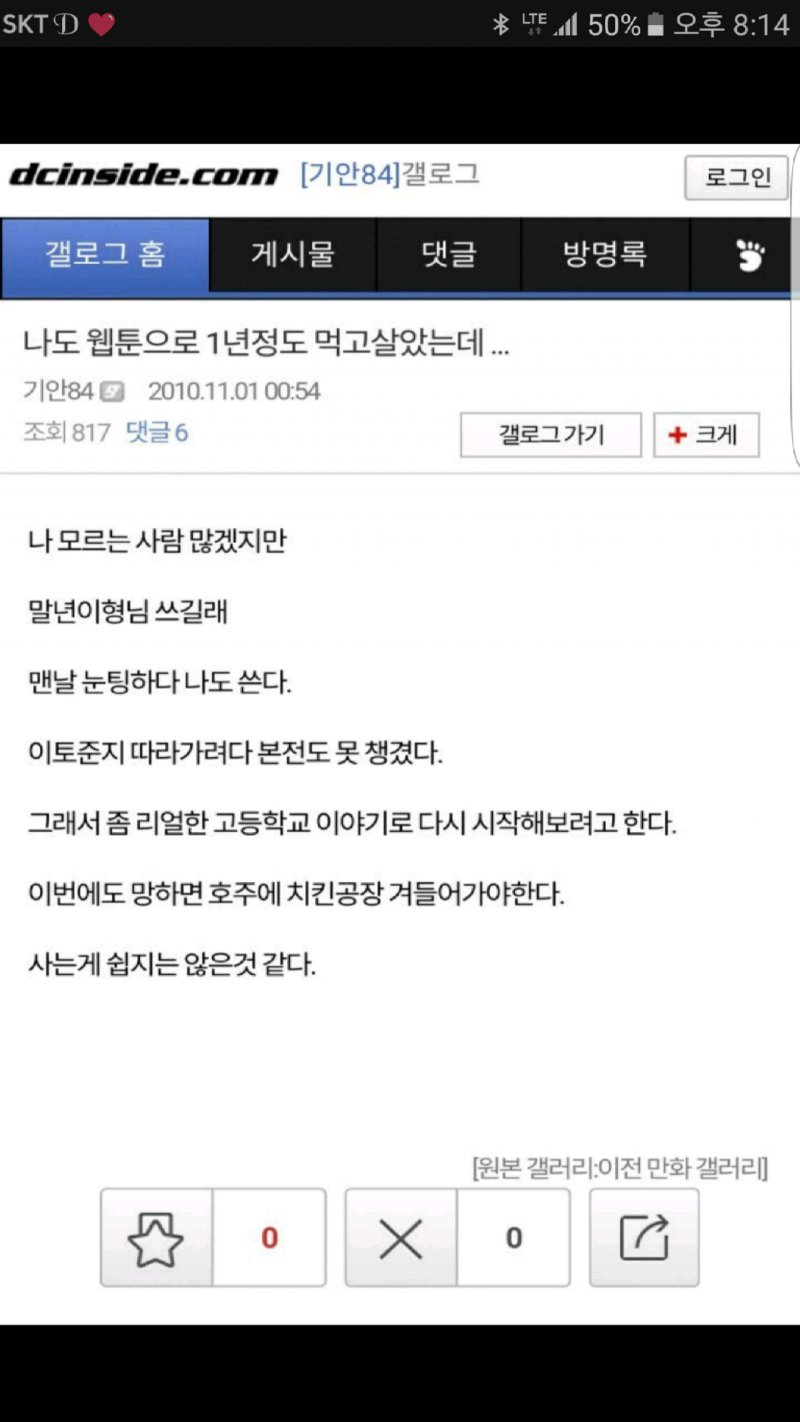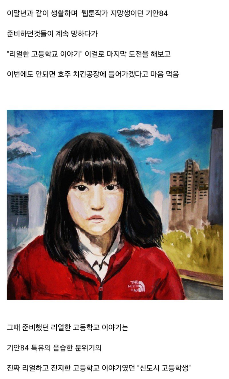 SKT 와 D.C.인사이드닷컴에서 [기안84]갤로그로 확인할 수 있는 글이다. 기안84이 웹툰으로 1년 동안 생활한 경험을 나누었는데, 그 동안 기안84은 이토준지를 따라가려다가 본 대로 이루지 못하고 고등학교 이야기를 다시 시작해보려고 한다고 한다. 만약 이번에도 실패하면 호주 치킨공장에 들어가겠다고 결심한 것 같다. 그리고 기안84은 이말년과 함께 생활하며 웹툰 작가 지망생이었는데, 계속해서 망하다가 "리얼한 고등학교 이야기"로 마지막 도전을 하게 되었다고 말한다. 그리고 또 다른 고등학교 이야기인 "패션왕"이 개그적인 요소를 가지고 있었고, 그때 준비한 리얼한 고등학교 이야기는 기안84만의 음습한 분위기로 이루어진 진실되고 진지한 이야기였던 "신도시 고등학생"이었다고 한다. 그리고 이말년에게 어떤 작품을 하면 좋을지 물어봤는데, 계속해서 개그 요소를 넣는 것을 추천받았다고 한다. 이것이 대충 기안84의 글을 정리한 내용이다.