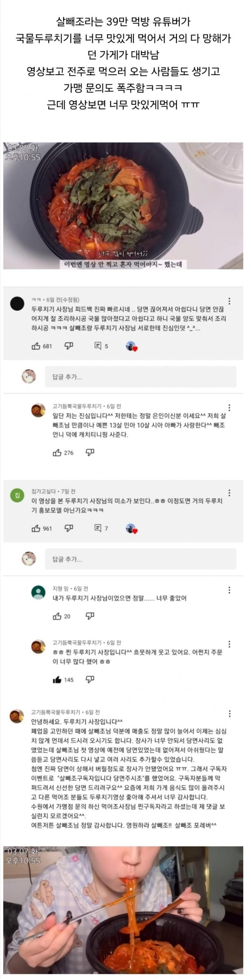 글 요약: 살빼조라는 유튜버가 국물두루치기를 맛있게 먹는 영상을 올리면서 해당 가게가 대박나고 사람들이 전주로 먹으러 오며 가맹 문의가 폭주했다. 영상에서는 두루치기가 맛있게 보이기 때문에 유튜버는 다음번에 혼자 먹을 예정이었지만 그만둬야 했다. 두루치기 사장님은 피드백을 빠르게 주고, 국물 양도 맞춰서 조리하는 등 살빼조와의 소통을 소중히 여기는 모습을 보였다. 이를 본 댓글에서는 유튜버와 당면에 대한 사장님의 성의를 칭찬하며, 가게의 매출이 증가했고 폐업 고민도 없어졌다는 이야기가 나왔다.