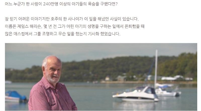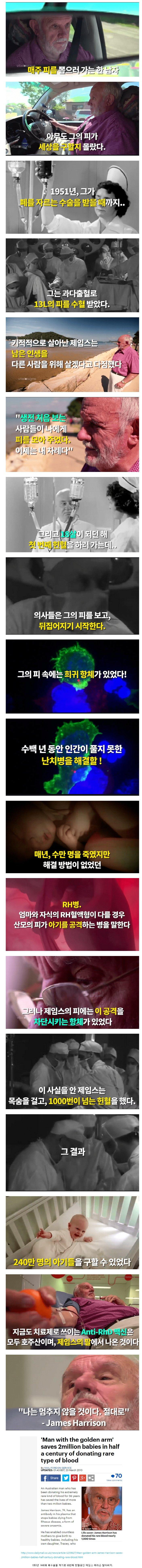 영국 외신에 따르면 호주 한 남성인 제임스 해리슨은 1951년 폐 수술을 받은 후부터 매주 정신적인 다짐을 하면서 생전에 처음 보는 사람들에게 헌혈을 요청했다. 그의 피 속에는 희귀한 항체가 있었고, 그는 이를 이용하여 수백 년 동안 인간이 풀지 못한 난치병을 해결하는 데 기여할 수 있었다. 특히, 엄마와 아기의 RH혈액형이 다를 경우 아기를 공격하는 병을 막는데 큰 역할을 했다. 제임스는 목숨을 걸고 1000번 이상의 헌혈을 했고, 이로써 호주산의 치료제가 되었으며 240만 명의 아기들을 구할 수 있었다. 그는 이 작업을 멈추지 않을 것이라고 다짐하며, 이를 통해 어려운 상황에서 생명을 구하는데 큰 기여를 하고 있다고 밝혔다.