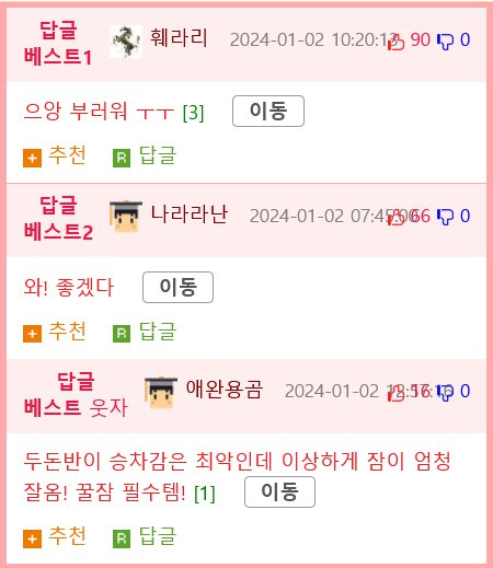 제목: 이동, 추천을 받은 답글 베스트1, 답글 베스트2에 대한 부러움