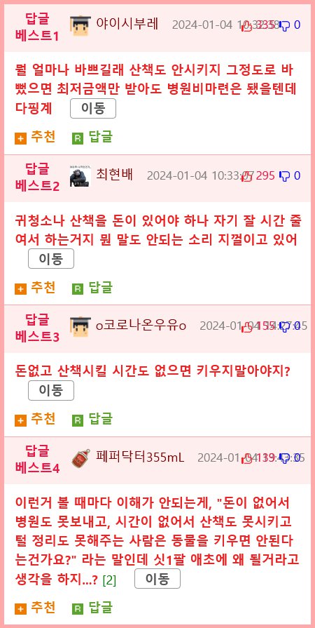 글을 요약하면, 주인인 '베스'가 형편이 안 좋아서 개를 포기하려고 했지만, 개는 첫 주인을 잊을 수 없으니까 계속해서 돌봤다고 한다. 그런데 개가 아프게 되고, 수술비 때문에 곤란한 상황에 처하게 되었다. 베스는 또 다른 좋은 가정을 찾아야 할 것 같다고 생각해서 글을 남겼는데, 이 글을 보고 '귀청, 트, 소'라는 사람이 이 개를 받아주겠다고 해서 다행이라고 이야기한다. 하지만 베스는 이렇게 글을 올리며 미미를 사랑한다고 하고, 미미를 위해서라면 어지간한 일이라도 할 수 있다고 말한다. 그리고 마지막으로 개를 안락사시키기 위해 경찰에 신고하기 전에 산책을 하면서 글을 마무리한다.