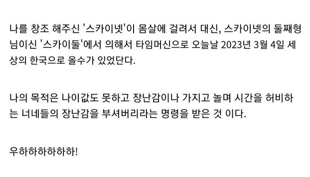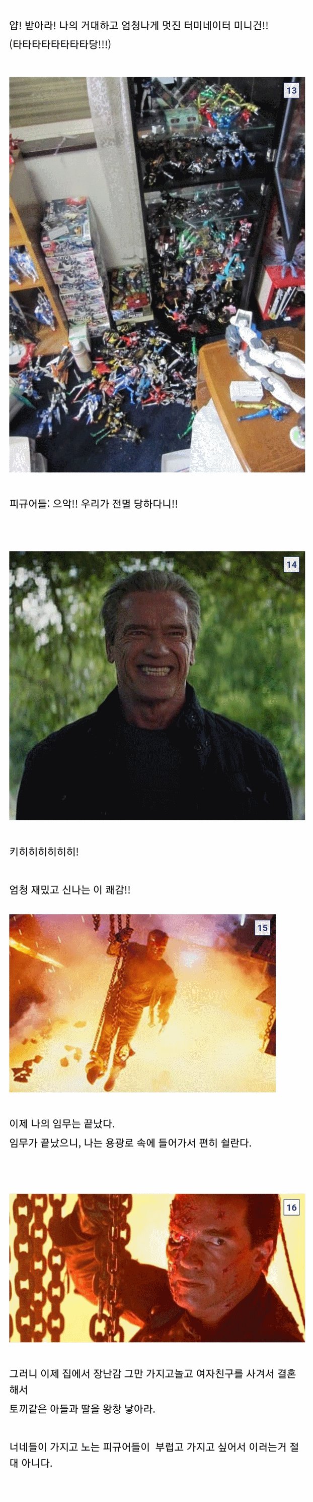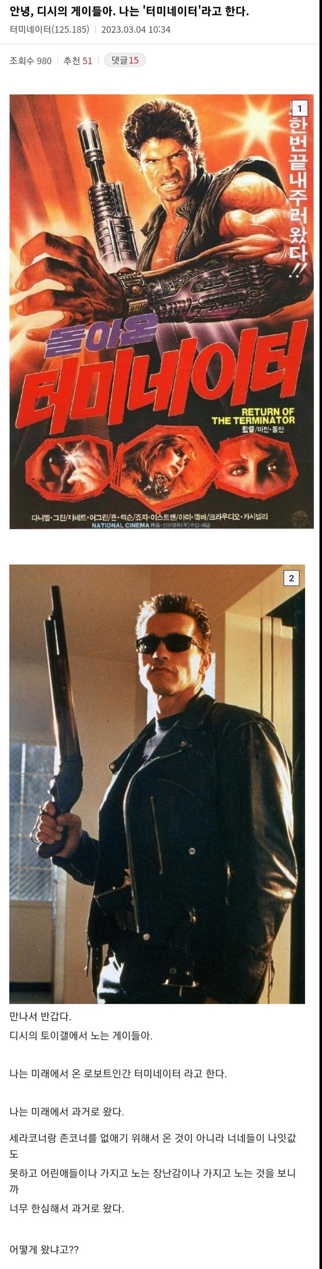 나는 '터미네이터'라고 한다. 나는 미래에서 온 로보트인간 터미네이터이며, 마틴돌만 만나서 반갑다. 나는 디시의 토이갤에서 노는 게이들을 위해 왔다.
