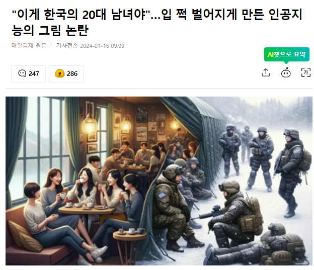 한국의 20대 남녀들에게 큰 관심을 받고 있는 인공지능 기술이 화제가 되고 있다. 최근 인공지능의 그림 작업 능력이 너무 뛰어나서 논란이 되고 있는데, 이에 대한 매일경제의 기사가 전해졌다. 이 기사는 2024년 1월 16일 오전 9시 9분에 작성되었으며, AI를 사용한 요약 책으로 제공되고 있다.