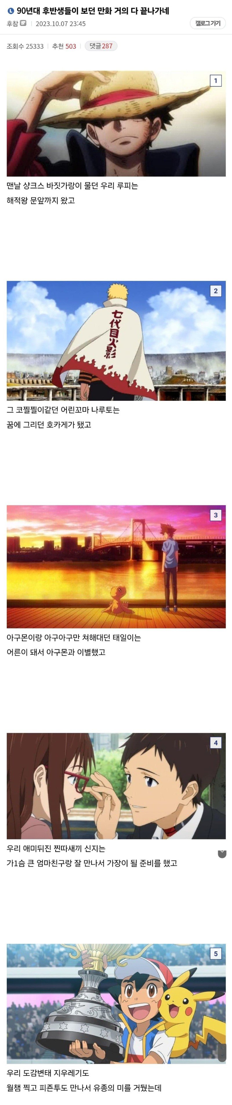 90년대 후반생들이 보던 만화 거의 다 끝나가네 밝은횃불 쪽지보내기자기소개아이디로 검색전체게시물 01-18 6,181 회 0 건 아니 만화 끝나면 회사망한다는 얘기 나온게 몇년 전인데아직도 그상황 그대로면노답인거지;; 90년대 후반생들이 보던 만화들이 점점 종료되고 있다는 것을 알려주는 기사다. 작성자는 캐릭터들을 언급하며 그들이 어떻게 성장했는지를 언급하고 있다. 그러나 글의 내용은 독자적인 문장이 아닌 단어들의 나열로 이루어져 있어, 글을 정확하게 파악하기 어렵다. 목록 이메일 주소는 공개되지 않습니다. 댓글 * 이름 * 비밀번호 * 비밀글 사용 제목 글쓴이 조회 날짜 월세 못내겠다고 문자한 외국인 아시가루 쪽지보내기자기소개아이디로 검색전체게시물 6,447 0 24-01-20 아시가루 쪽지보내기자기소개아이디로 검색전체게시물 6,447 24-01-20 뭔가 타는 냄새 나지 않아요? 재미난도시락 쪽지보내기자기소개아이디로 검색전체게시물 6,389 0 24-01-19 재미난도시락 쪽지보내기자기소개아이디로 검색전체게시물 6,389 24-01-19 박준형 딸이 새벽 5시 40분 등교하는 이유 옆집총각 쪽지보내기자기소개아이디로 검색전체게시물 6,306 0 24-01-19 옆집총각 쪽지보내기자기소개아이디로 검색전체게시물 6,306 24-01-19 연예인 갑질 폭로하는 스태프 모카크림 쪽지보내기자기소개아이디로 검색전체게시물 6,446 0 24-01-19 모카크림 쪽지보내기자기소개아이디로 검색전체게시물 6,446 24-01-19 아들이 허약해서 농구시킨 가족.jpg 옆집총각 쪽지보내기자기소개아이디로 검색전체게시물 6,830 0 24-01-18 옆집총각 쪽지보내기자기소개아이디로 검색전체게시물 6,830 24-01-18 전교 꼴찌에서 연세대 경제, 수의대 합격한 남자. 몽비쥬 쪽지보내기자기소개아이디로 검색전체게시물 6,250 0 24-01-18 몽비쥬 쪽지보내기자기소개아이디로 검색전체게시물 6,250 24-01-18 ⭐ 90년대 후반생들이 보던 만화 거의 다 끝나가네 밝은횃불 쪽지보내기자기소개아이디로 검색전체게시물 6,182 0 24-01-18 밝은횃불 쪽지보내기자기소개아이디로 검색전체게시물 6,182 24-01-18 전설의 플라시보 효과 .jpg 동태탕 쪽지보내기자기소개아이디로 검색전체게시물 6,172 0 24-01-17 동태탕 쪽지보내기자기소개아이디로 검색전체게시물 6,172 24-01-17 AI 가 그린 한국의 20대 남녀 모카크림 쪽지보내기자기소개아이디로 검색전체게시물 6,836 0 24-01-17 모카크림 쪽지보내기자기소개아이디로 검색전체게시물 6,836 24-01-17 썸녀랑 아쿠아리움 가기로 함.talk 1 얼음사이다 쪽지보내기자기소개아이디로 검색전체게시물 6,725 1 24-01-17 얼음사이다 쪽지보내기자기소개아이디로 검색전체게시물 6,725 24-01-17 자기 관리 안한 스포츠선수의 최후.jpg 1 지니까꿍 쪽지보내기자기소개아이디로 검색전체게시물 5,965 1 24-01-16 지니까꿍 쪽지보내기자기소개아이디로 검색전체게시물 5,965 24-01-16 요식업 폐업률이 높은 이유 아시가루 쪽지보내기자기소개아이디로 검색전체게시물 6,391 0 24-01-16 아시가루 쪽지보내기자기소개아이디로 검색전체게시물 6,391 24-01-16 곶감 때문에 공항에서 걸린 한국인.jpg 옆집총각 쪽지보내기자기소개아이디로 검색전체게시물 6,576 0 24-01-16 옆집총각 쪽지보내기자기소개아이디로 검색전체게시물 6,576 24-01-16 러시아인이 말하는 한국인의 집착 금단비 쪽지보내기자기소개아이디로 검색전체게시물 6,144 0 24-01-15 금단비 쪽지보내기자기소개아이디로 검색전체게시물 6,144 24-01-15 일본 기자의 악에 받친 답변 요구... 지니까꿍 쪽지보내기자기소개아이디로 검색전체게시물 6,110 0 24-01-15 지니까꿍 쪽지보내기자기소개아이디로 검색전체게시물 6,110 24-01-15 코로나 시국 동선 공개 유명했던 사람 모카크림 쪽지보내기자기소개아이디로 검색전체게시물 6,189 0 24-01-15 모카크림 쪽지보내기자기소개아이디로 검색전체게시물 6,189 24-01-15 시민들의 가속 노화를 막기위해 싱가포르에서 하는 것 몽비쥬 쪽지보내기자기소개아이디로 검색전체게시물 6,488 0 24-01-14 몽비쥬 쪽지보내기자기소개아이디로 검색전체게시물 6,488 24-01-14 IMF 당시 하루에 쏟아져 나온 실업자 수 jpg 지니까꿍 쪽지보내기자기소개아이디로 검색전체게시물 6,244 0 24-01-14 지니까꿍 쪽지보내기자기소개아이디로 검색전체게시물 6,244 24-01-14 NH 주식 어플 근황.gif 얼음사이다 쪽지보내기자기소개아이디로 검색전체게시물 6,197 0 24-01-14 얼음사이다 쪽지보내기자기소개아이디로 검색전체게시물 6,197 24-01-14 조두순 부부의 재테크 달콤별 쪽지보내기자기소개아이디로 검색전체게시물 6,642 0 24-01-13 달콤별 쪽지보내기자기소개아이디로 검색전체게시물 6,642 24-01-13 남양유업 진짜 너무해요.jpg 밝은횃불 쪽지보내기자기소개아이디로 검색전체게시물 5,949 0 24-01-13 밝은횃불 쪽지보내기자기소개아이디로 검색전체게시물 5,949 24-01-13 어느 서울대생의 사기 당한돈 돌려받기 과정 밝은횃불 쪽지보내기자기소개아이디로 검색전체게시물 6,601 0 24-01-13 밝은횃불 쪽지보내기자기소개아이디로 검색전체게시물 6,601 24-01-13 "2시간 동안 200개" 인형뽑기 싹쓸이男..처벌 논란 옆집총각 쪽지보내기자기소개아이디로 검색전체게시물 6,285 0 24-01-12 옆집총각 쪽지보내