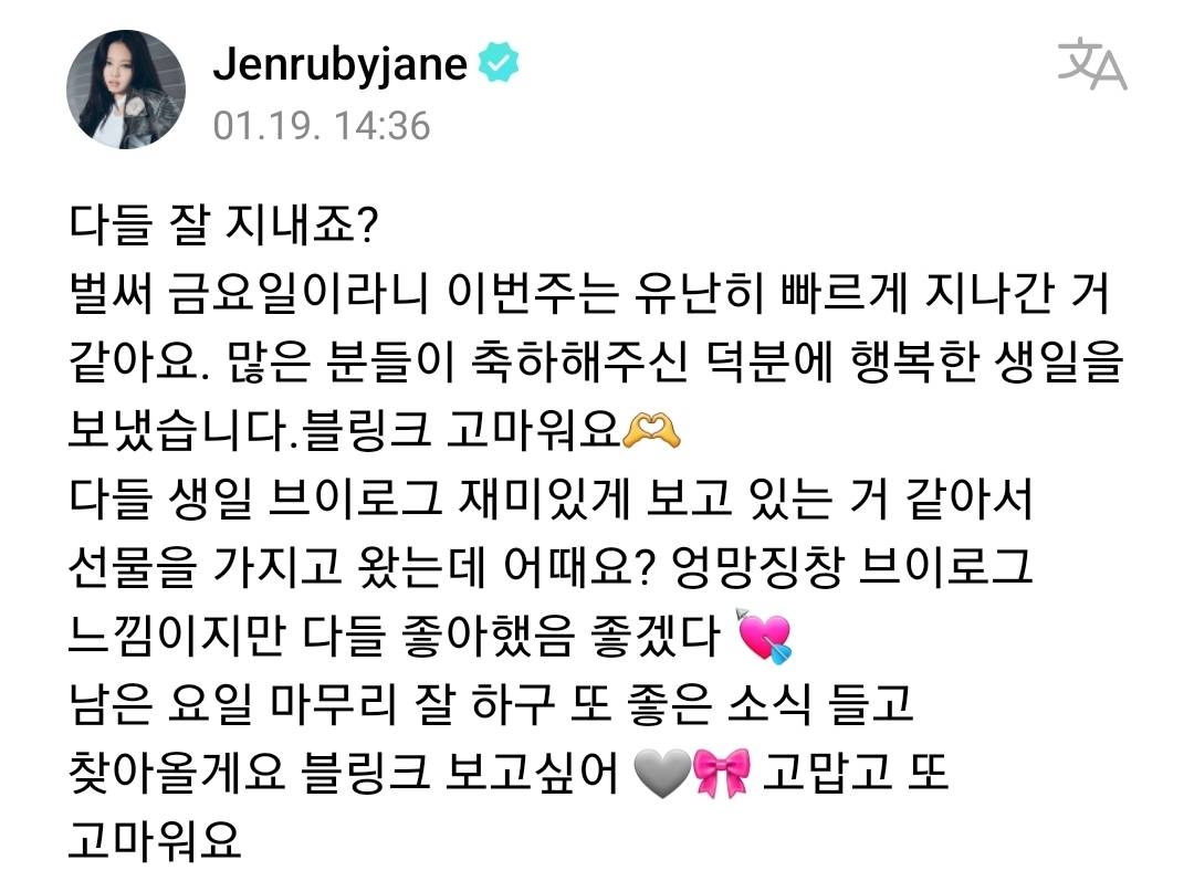 다들 좋은 주말 보냈나요? 저는 블링크 A일 생일 선물을 받아서 기분이 좋아요. 다른 분들도 선물 주셔서 감사합니다. 이번 주는 빨리 지나간 것 같아요. 이제는 다른 좋은 소식을 기다리고 있어요. 제니 Pons님의 브이로그도 재미있을 것 같아요. 어떨까요? 또 여러분들에게 좋은 소식이 생기면 알려주세요.