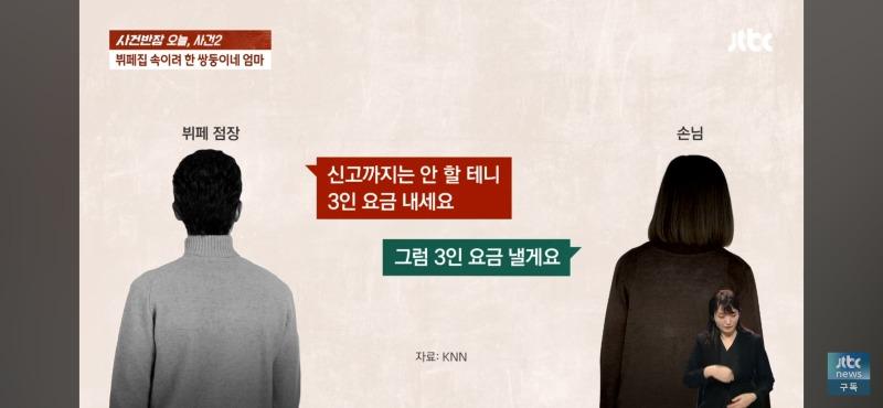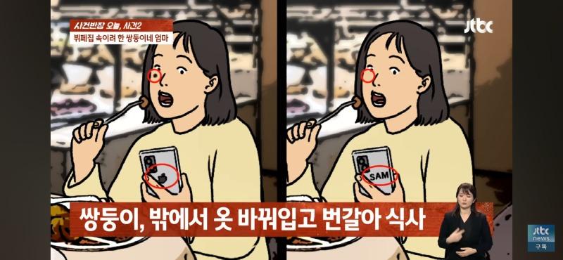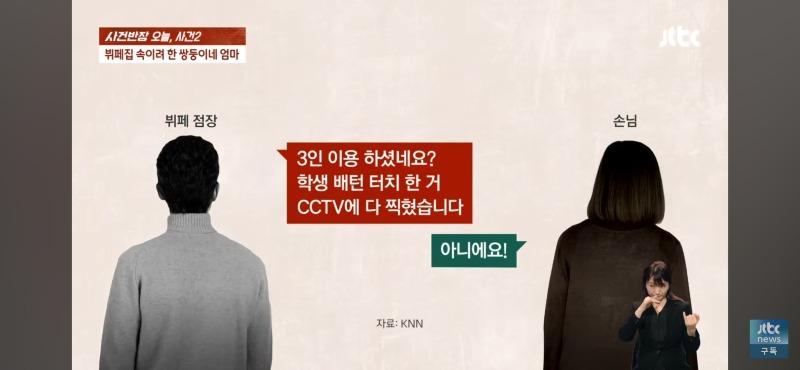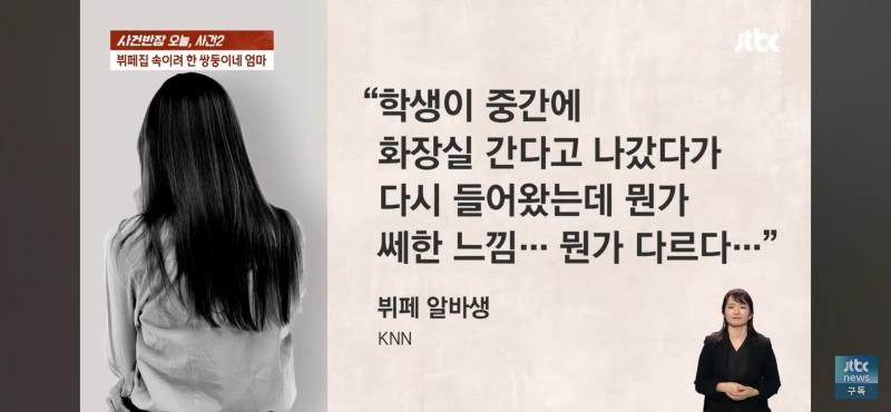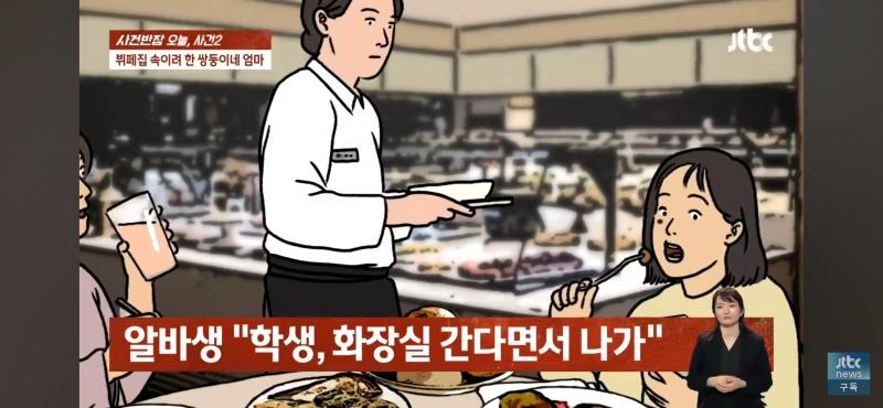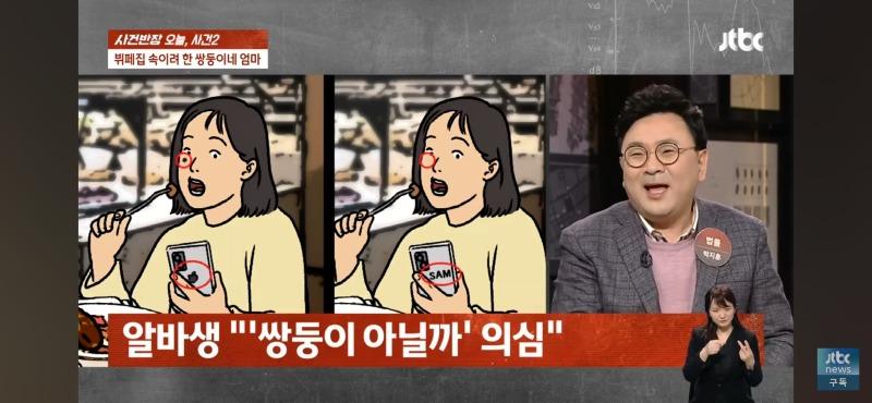 사건반장은 오늘 뷔페에서 발생한 사건에 대해 보도하고 있다. 사건은 쌍둥이의 엄마가 자녀와 함께 뷔페를 방문하려고 한 것인데, 알바생이 엄마와 자녀 1명의 방문을 허락한 후 화장실에 들어간 학생이 잠시 나와서 다시 들어온 뒤 이상한 느낌을 준다는 것을 눈치챈 것이다. 현장을 확인하기 위해 CCTV를 확인한 결과, 알바생의 말처럼 쌍둥이 아닌가 의심스러운 점이 드러났다. 또한, 다른 알바생들의 증언에 따르면, 두 아이의 머리 길이와 등의 세부적인 차이가 있었다고 한다. 이에 사건반장은 알바생의 이야기가 소설이 아니라는 매니저의 말에 관련 CCTV 자료를 확인하여 쌍둥이 아닐까 의심하고자 한다. 그러나 뷔페 점장은 알바생의 이야기와 관련 CCTV 자료를 확인한 뒤 쌍둥이가 아니라는 판단을 내리고, 이를 알리기 위해 KNN에 전화를 걸었고, KNN은 학생이 화장실에 간다고 나갔다가 다시 들어오는 모습을 CCTV로 확인한 뒤 뭔가 다른 느낌이 든다고 보도했다. 이에 사건반장은 KNN과의 대화 내용에 대한 법률 자료를 확인하여 3인 이용 요금을 내도록 요구했다. 그러나 쌍둥이의 엄마는 알바생의 이야기와 관련 CCTV 자료를 확인한 후 다르게 말하고 3인 요금을 내기로 했다. 모두가 놀라운 사건이라며 이야기하는 가운데, 여전히 수수께끼로 남아있는 쌍둥이의 엄마의 행동이 혼란을 가중시킨다.이렇게 다양한 이야기와 관찰 결과를 토대로 앞으로의 사건 발전을 예측할 수 없는 상황에서 이야기가 진행된 것으로 나타나고 있다.