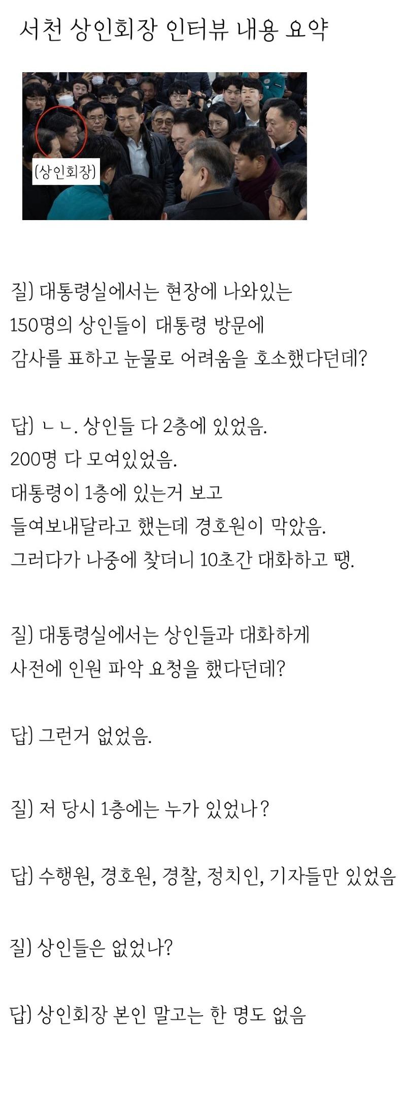 - 상인회장은 서천 상인들이 대통령 방문에 감사를 표하고 어려움을 호소한 것은 사실이 아니라고 말했다.
