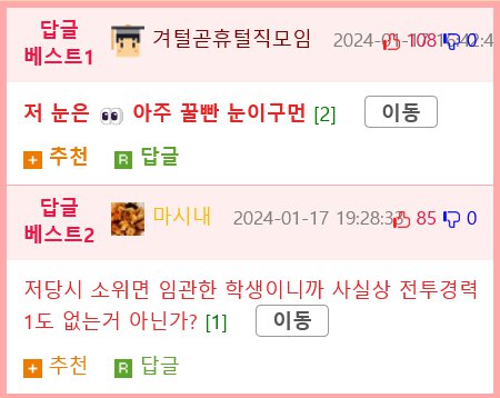 KAZUO SAKAMAKI는 HJ 1 MI라는 답글에 베스트1로 답장을 받았다. 그러나 그는 마음이 안좋은 듯 하다. 그리고 그는 겨털곧휴털직모임이라는 날짜와 숫자를 기입하고 있다. 또한 베스트2로 또다른 답글도 받았는데, 눈이 좋고 귀여운 눈이라는 칭찬을 받고 있다. 또한 이동 마시내라는 사람이 2024년 1월 17일에 답글을 남기고 있고, 전투경력이 없다는 의문을 제기하고 있다. 이와 관련하여 다른 사람이 또다른 답글을 남기고 있다.
