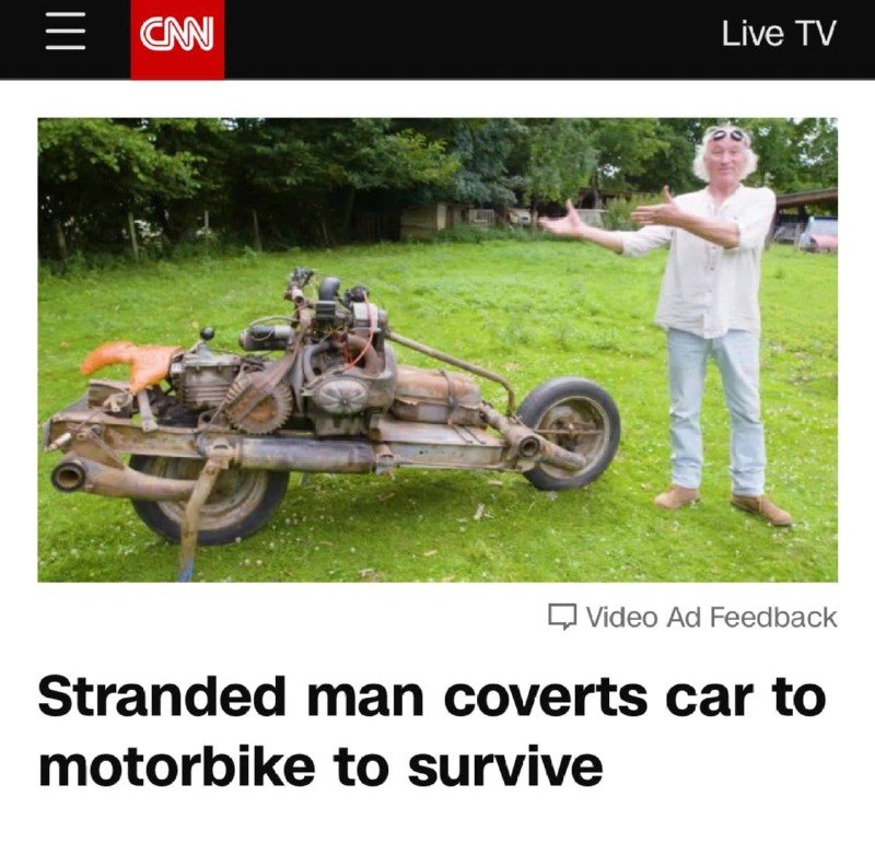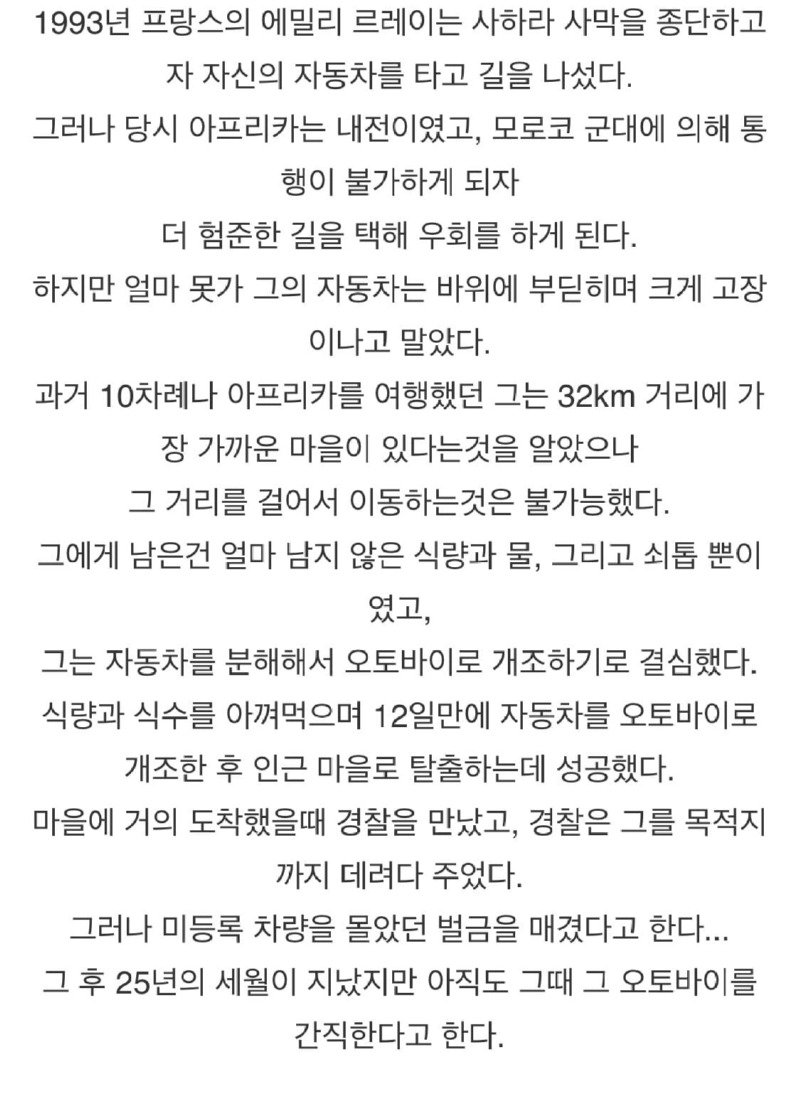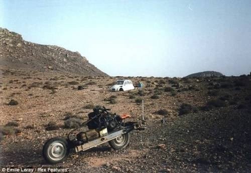 1993년에 프랑스의 에밀리 르레이는 사하라 사막을 종단하고 자신의 자동차를 이용하여 길을 나섰습니다. 그러나 아프리카는 내전 상황이었고, 모로코 군대에 의해 통행이 불가능하게 되어 더 험준한 길을 택하게 되었습니다. 하지만 그의 자동차는 바위에 부딛혀 큰 고장이 나게 되었습니다. 그는 주변에 가장 가까운 마을까지 걸어서 이동할 수 없기 때문에 남은 식량과 물, 그리고 쇠톱을 이용하여 자동차를 오토바이로 개조하기로 결심했습니다. 그는 식량과 식수를 아껴가며 12일 동안에 자동차를 개조한 후에 인근 마을로 탈출하는 데에 성공했습니다. 그러나 마을에 거의 도착했을 때 경찰에게 만나게 되었고, 경찰은 그를 목적지까지 데려다 줬지만 미등록 차량을 운전했던 혐의로 벌금을 부과했습니다. 25년이 지난 지금도 그는 그때 개조한 오토바이를 소중하게 간직하고 있다고 합니다.