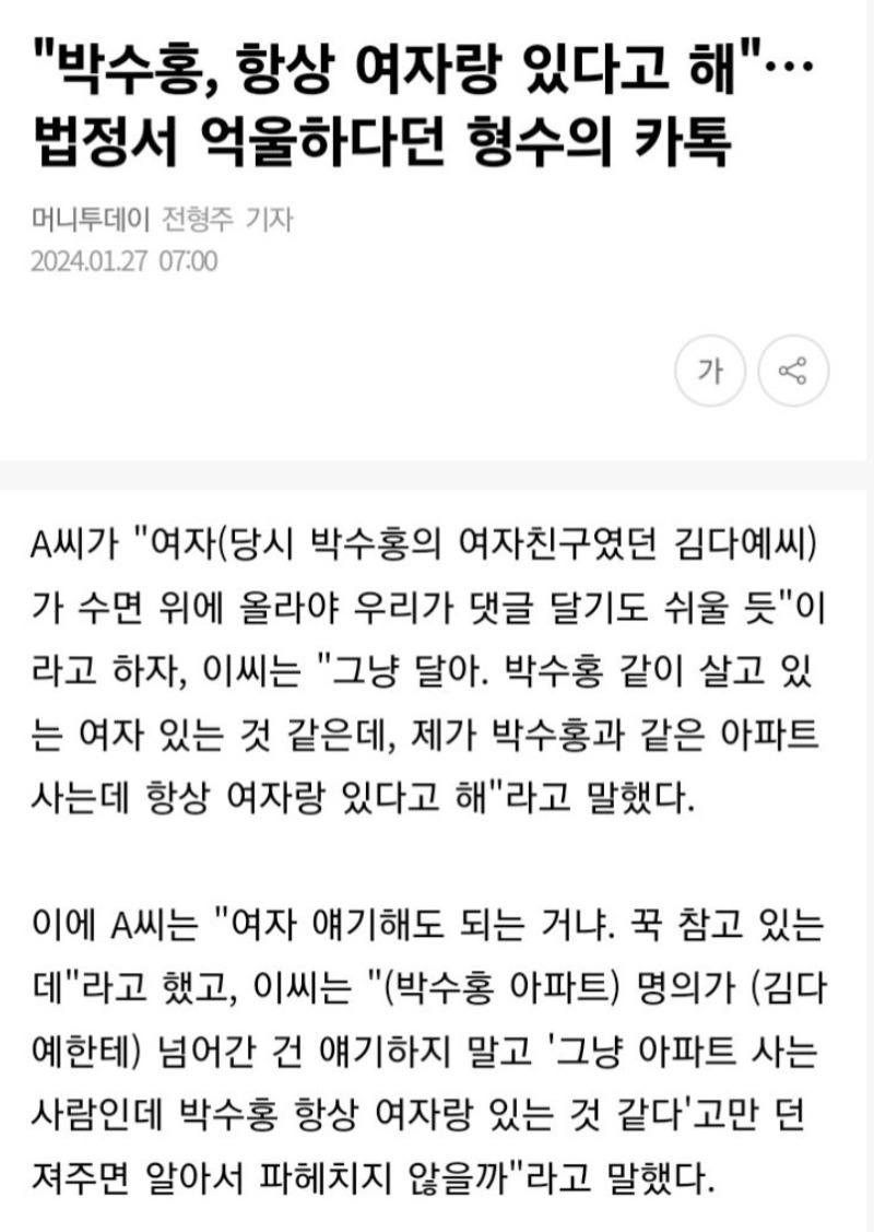 A씨는 이씨에게 "여자 얘기해도 되는 거냐. 꾹 참고 있는데"라고 물었습니다. 이에 이씨는 "(박수홍 아파트) 명의가 (김다예에게) 넘어간 건 얘기하지 말고 '그냥 아파트 사는 사람인데 박수홍 항상 여자랑 있는 것 같다'고만 던져주면 알아서 파헤치지 않을까"라고 말했습니다. 거짓말이 퍼진 경로입니다.