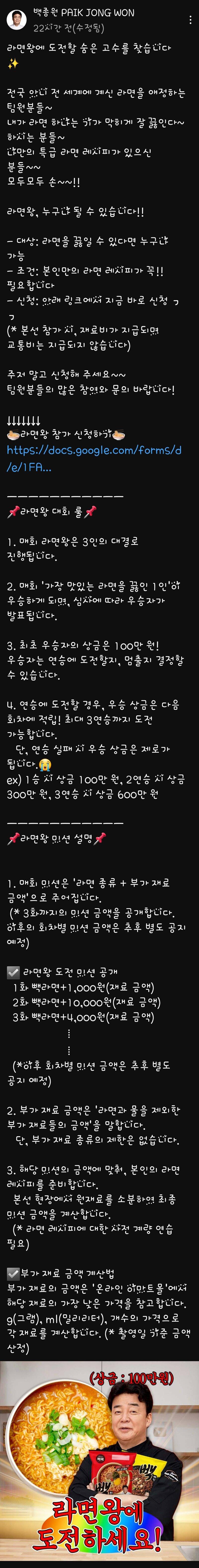 백종원은 라면왕에 도전할 숨은 고수를 찾고 있는 모양이다. 전 세계에 있는 라면을 애정하는 팀원들을 찾고 있다고 한다. 자신이 라면을 잘 끓인다고 하는 분들, 특급 라면 레시피를 가지고 있는 분들은 지금 신청해야 한다고 한다. 본선 참가자는 재료비만 지급되며 교통비는 지원되지 않는다고 한다. 라면왕 대회의 룰은 매 회차마다 3인의 대결로 진행되며 가장 맛있는 라면을 끓인 1인이 우승하게 된다. 우승자는 상금 100만 원을 받을 수 있고 연승에 도전할지, 멈출지 결정할 수 있으며 최대 3연승까지 도전 가능하다. 미션은 라면 종류와 부가 재료 금액으로 주어지며 별도로 공지될 예정이다. 부가 재료 금액은 라면과 물을 제외한 부가 재료들의 금액을 의미한다. 모든 참가자는 자신의 레시피를 준비해야 한다. 이 대회는 활기찬 참여와 문의를 기대한다.