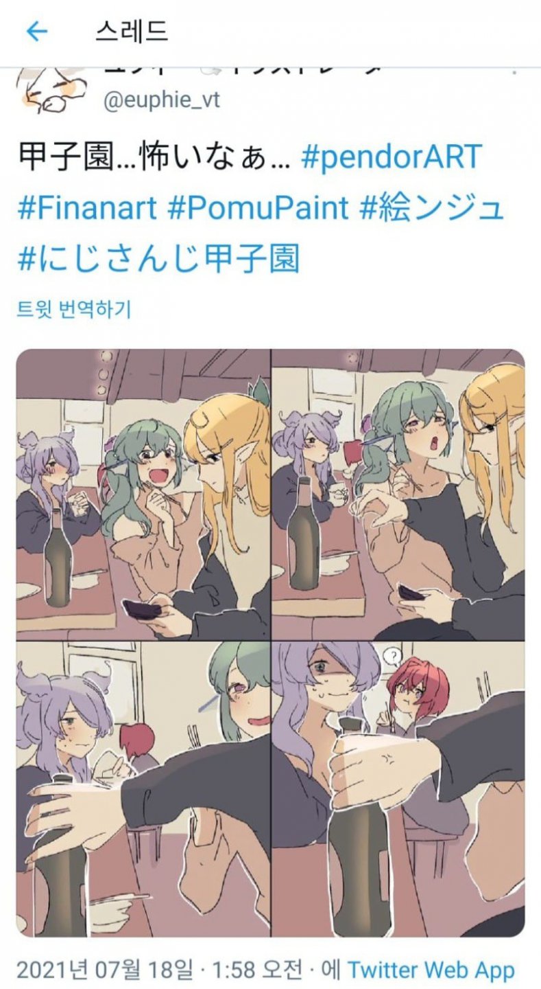 스레드 작성자 @euphie_vt가 2021년 7월 18일 오전 1시 58분에 "甲子園...怖心本訴..."라는 글을 작성했습니다. 이 글은 해시태그 #pendorART, #Finanart, #PomuPaint, #絵그, #巴古人心甲子園가 포함되어 있습니다. 작성자는 어떤 이미지인지는 알 수 없지만 그림을 정말 좋아하는 것 같습니다. 이 글에는 22개의 좋아요와 18개의 리트윗이 달려있습니다.
