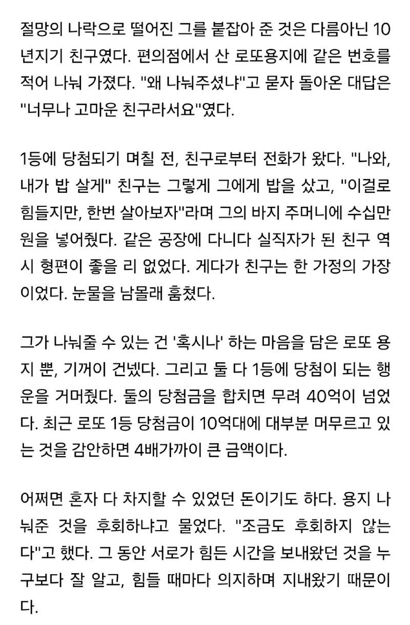 깊은 절망 속에서도 A씨를 붙잡아 준 것은 10년 동안의 친구였다. A씨는 편의점에서 로또용지를 사서 같은 번호를 적은 것이었다. 이를 통해 두 사람은 매일 일상에서 일어나는 어려움과 빚에 시달리던 상황에서 벗어나기 위한 작은 희망을 찾았고, 결국 로또 '더블 1등'에 당첨되게 되었다.
