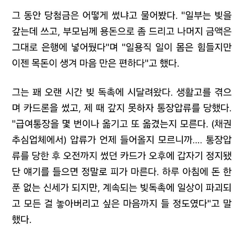 로또 당첨 후에도 A씨는 일용직 자리를 찾아 떠돌아다니며 살아가고 있다고 한다. 정규직 일자리를 구하기가 어려워졌기 때문에, 당장 당첨금으로 사업을 하는 것도 엄두가 나지 않았다고 한다. 그래서 그동안 당첨금은 부채 갚는 데에 사용하고, 부모님에게 용돈을 드리고, 나머지 금액은 은행에 넣어두었다고 한다.