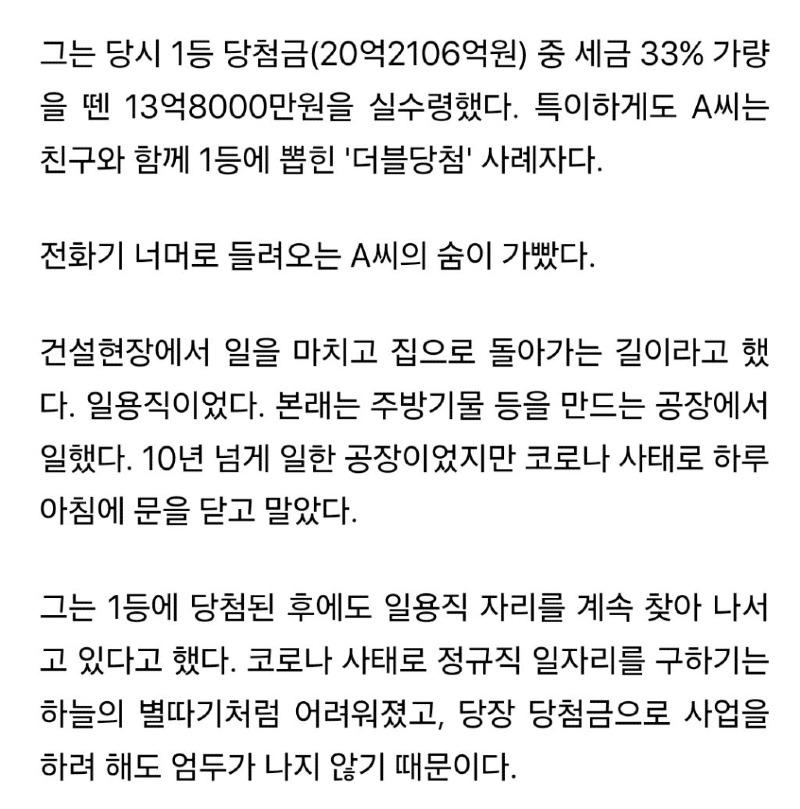 이들의 이야기는 특이하기도 했다. A씨가 알려준 바에 따르면, 그들은 '더블 1등'에 당첨되었던 것이다. A씨는 건설 현장에서 일을 마치고 집으로 돌아가는 길에 전화를 받았다고 한다. 그러나 A씨는 원래 주방기물을 만드는 공장에서 일하던 일용직이었는데, 코로나 사태로 인해 공장이 문을 닫아버린 것이었다.