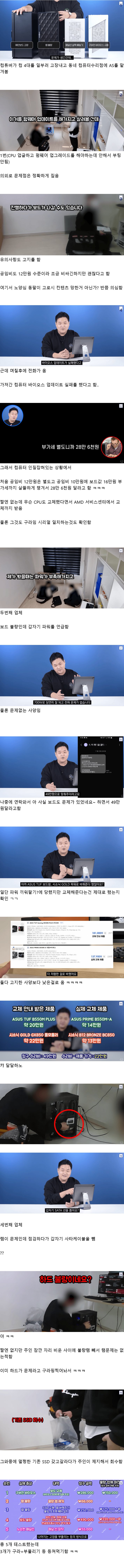문제가 생긴 것은 컴퓨터가 4대가 고장나고 컴퓨터 수리점에 수리를 맡기게 되었다는 것이다. 1번 컴퓨터는 CPU 업그레이드와 펌웨어 업그레이드를 해야하는데 이 과정을 안 해서 부팅이 안 된다는 문제가 발생했다. 의외로 수리점은 문제점을 정확하게 짚었고 유의사항도 알려주었다. 수리점에서는 펌웨어 업데이트를 해줘서 컴퓨터를 다시 살릴 수 있지만 공임비가 12만원 정도로 조금 비싸다고 한다. 이 때 동네 컴퓨터수리점 주인인 노양심 동팔이는 컨텐츠가 망한 것은 아닌지 의심하지만 며칠 후에 전화가 왔다. 전화에서는 처음 수리를 맡은 곳에서는 컴퓨터의 보드가 나갈 수도 있다고 알려줬다. 그래서 두 번째 수리업체에 다시 맡게 되는데 공임비는 처음에 12만원별도로, 그리고 10만원에 보드값 16만원과 부가세를 모두 합쳐 28만 6천원을 요구하였다. 이 때 화 제대로 없는데도 무슨 CPU도 교체했다는 말을 하면서 AMD 서비스 센터에서 교체를 받았다고 주장하였다. 하지만 메인보드가 고장 났다는 것도 사실이 아니었고, 시리얼 번호도 일치하는 것을 확인할 수 있었다. 그리고 문제없는 사양의 부품들이었다. 내가 보기에는 파워가 부족해서 보드가 문제가 되었을 것이라고 생각했는데 갑자기 파워를 언급했다. 파워를 확인하기로 했다. 그러나 B라는 업체는 아무런 대답을 하지 않았다. 49만원으로 맞춰준다고 했던 첫 번째 업체는 나중에 연락을 하면서 보드도 문제가 있었다고 해서 49만원으로 해결할 수 있다고 말했다. 이제 세 번째 업체에게 답변을 기다리고 있는데 둘 다 고지한 사양보다 낮은 ASUS TUF를 수리해준 것으로 보인다. 아까는 ASUS TUF 스트릭스 2를 수리해준다고 했었는데 램이 불량이라는 이유로 5개의 램을 고쳐준다고 했다. 하지만 이것은 구라였다. 그리고 바이오스 업데이트가 실패했다는 것도 거짓말이었고, 보드도 불량이 아니었다. 느슨한 패널선만 만지지 않았다면 전혀 문제가 없었다는 사실을 알게 되었다. 제품은 TUF Gaming B560M-PLUS WIFI AMD(AM4)/AMD 8550/M-ATX이었다. (244x244)