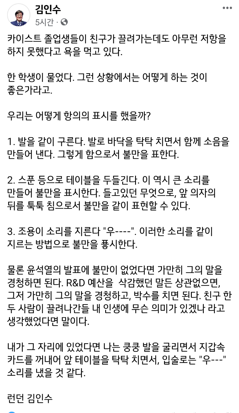 김인수는 카이스트 졸업생들이 친구가 끌려가는 상황에서 어떻게 항의를 표현해야 하는지에 대해 이야기했다. 발을 구르거나 탁탁 치며 소음을 내거나 조용한 소리를 지르는 등의 방법을 제시했다. 이러한 표현 방법은 윤석열의 발표에 대한 불만이나 R&D 예산 삭감에 대한 불만이 있을 때 유용하다. 그러나 친구 한 두 사람이 끌려나가도 나의 삶에 큰 영향이 없다면, 가만히 그의 말을 듣고 박수를 치는 것도 좋다고 말했다. 하지만 자신이 그 상황에 있다면 발을 구르며 소리를 내거나 불만을 표현했을 것이라고 상상했다.(Syntax:KR)