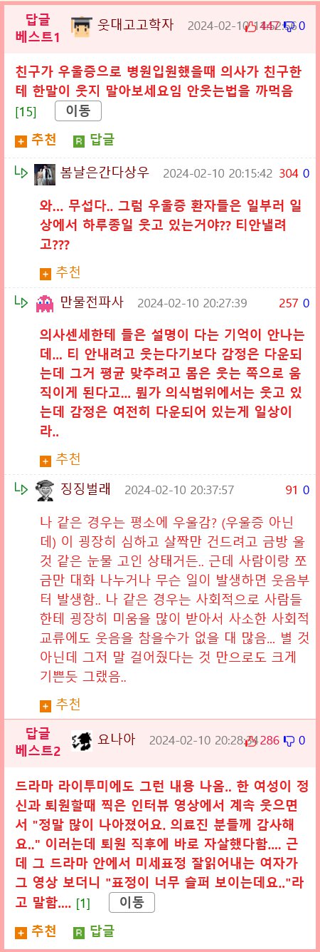 사람들이 STARECAT.COM에서 이야기하는 이야기를 정리해드릴게요. 실제 우울증의 모습을 이야기하는 기사에서는 친구가 우울증으로 병원에 입원했을 때 의사가 친구에게 한 말이 웃지 말아보세요라는 것이었습니다. 또한, 다른 이야기에서는 우울증 환자들이 일부러 웃는 것인지 의문을 제기하며, 우울증 환자의 감정은 여전히 다운되어 있지만 몸은 웃는 쪽으로 움직이는 것이라는 설명도 나왔습니다. 또한, 다른 사람은 사소한 사회적 교류에서도 웃게 되는데 이는 우울증의 증상 중 하나인 것 같습니다.마지막으로, 한 드라마에서는 캐릭터가 퇴원한 후에 자살을 한 이야기도 나왔는데, 이를 미세한 표정으로 잘 읽어내는 여자가 슬픈 표정을 보여서 말했다는 내용도 있었습니다. 이렇게 사람들이 우울증과 관련한 이야기를 나누고 있습니다.