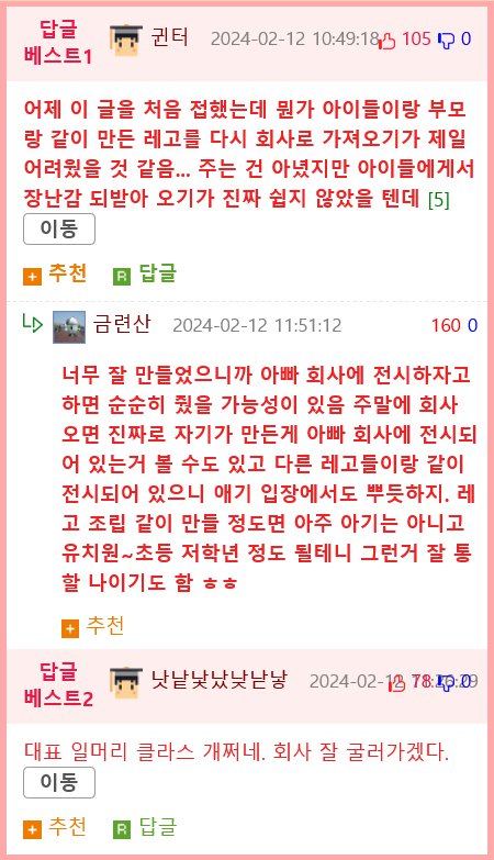 회사 대표가 발랄한 회사 분위기를 위해 레고를 구매하라는 지시를 내렸다. 총무팀은 네 괜찮은 제품을 찾기 위해 블록카페를 조사하고, 한 곳에서 나온 제품을 통째로 구매해왔다. 그러나 레고를 조립할 사람이 없어 고민하는데, 대표가 이를 보고 직원들에게 레고를 가지고 집에서 조립해오라고 했다. 조립한 레고와 자녀와 함께 찍은 사진을 올리면 상품권을 주겠다고 하여 다음주 월요일까지 레고 조립이 완료되었다. 블록카페 분위기를 만들기 위해 남은 레고로 비어있는 방을 블록카페로 만들어 직원들과 자녀들이 놀 수 있도록 했다. 회사 분위기가 전체적으로 밝고 즐거워진 것 같다.
