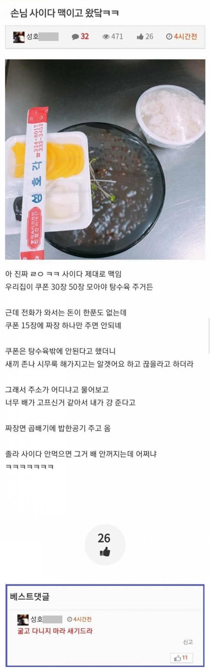 손님 사이다 맥이고 왔다. 성호 조금만 좀 더 주세요. U 32번지에 있는 집에 계셔서 진짜 쿠폰을 모아야 하는데 요즘 돈이 없어서 어떻게 맥주 샷 한 잔 주세요. 15장의 쿠폰으로 짜장면 한 그릇만 주시면 안돼요? 주소가 어떻게 되시죠? 배고파서 그냥 짜장면 곱배기와 밥 한 공기도 주세요. 쿠폰은 탕수육만 되는 거잖아요. 사이다를 안 먹으면 배 안 꺼지는데 어떻게 해야 할까요?굶고 다니지 마세요! 파리 패리세요!