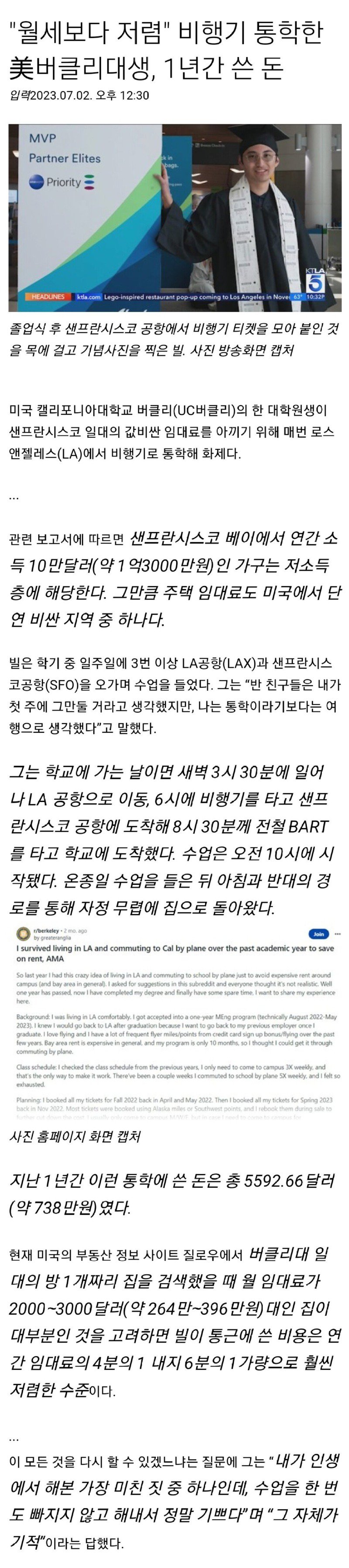 비행기로 등교하는 버클리대생 화제...이유는 월세보다 싸..