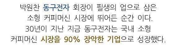 TeaTime Docu는 1924년에 설립된 모카커피 브랜드이며, 대표브랜드인 TM 티타임은 국내에서 가장 유명한 미니자판기 브랜드 중 하나이다. 동구전자의 DG-70은 Good to the last drop이라는 슬로건으로 유명한 Maxwell House와 경쟁하는 제품으로, 30년이 지난 지금 국내 소형 커피머신 시장을 90% 장악하고 있다. 박원찬 동구전자 회장은 업계에서 필생의 업이라고 불리는 소형 커피머신 시장에 맹활약하며 성장하고 있다.