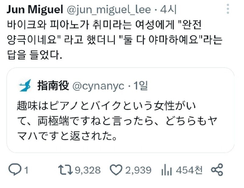 극과 극은 통한다. 몽비쥬 쪽지보내기자기소개아이디로 검색전체게시물 03-05 5,662 회 0 건 Jun Miguel @jun_miguel_lee. 바이크와 피아노를 좋아하는 여성에게 "완전 양극이네요" 라고 했더니 "둘 다 야마하예요"라는 대답을 받았다. 취미는 피아노와 바이크인 여성이 있는데, 그 두 가지가 정말 상반된 것 같네요. 하면 "둘 다 야마하예요" 라고 답하더군요. 목록 이메일 주소는 공개되지 않습니다. 댓글 * 이름 * 비밀번호 * 비밀글 사용 제목 글쓴이 조회 날짜 전설의 배달원 모카크림 쪽지보내기자기소개아이디로 검색전체게시물 6,142 0 24-03-14 모카크림 쪽지보내기자기소개아이디로 검색전체게시물 6,142 24-03-14 지잡대가거나 대학 안나와도 안망함 황희림 쪽지보내기자기소개아이디로 검색전체게시물 6,550 0 24-03-13 황희림 쪽지보내기자기소개아이디로 검색전체게시물 6,550 24-03-13 아들 성공하자 18년 만에 나타난 아버지. 몽비쥬 쪽지보내기자기소개아이디로 검색전체게시물 6,400 0 24-03-13 몽비쥬 쪽지보내기자기소개아이디로 검색전체게시물 6,400 24-03-13 높은 확률로 금요일 당첨 ㄷㄷ JPG 달콤별 쪽지보내기자기소개아이디로 검색전체게시물 6,292 0 24-03-13 달콤별 쪽지보내기자기소개아이디로 검색전체게시물 6,292 24-03-13 호주에서 아동성적대상화라고 욕먹은 광고 옆집총각 쪽지보내기자기소개아이디로 검색전체게시물 6,399 0 24-03-13 옆집총각 쪽지보내기자기소개아이디로 검색전체게시물 6,399 24-03-13 한혜진이 먹는 과자 양 차하영 쪽지보내기자기소개아이디로 검색전체게시물 5,962 0 24-03-12 차하영 쪽지보내기자기소개아이디로 검색전체게시물 5,962 24-03-12 무인텔 별점 1개 썰..jpg 1 재미난도시락 쪽지보내기자기소개아이디로 검색전체게시물 6,242 1 24-03-12 재미난도시락 쪽지보내기자기소개아이디로 검색전체게시물 6,242 24-03-12 모르는 번호 안 받는 사람 중 끝판왕 동태탕 쪽지보내기자기소개아이디로 검색전체게시물 6,324 0 24-03-12 동태탕 쪽지보내기자기소개아이디로 검색전체게시물 6,324 24-03-12 유전자검사 필수로 해야 되는 이유 1 몽비쥬 쪽지보내기자기소개아이디로 검색전체게시물 6,602 1 24-03-11 몽비쥬 쪽지보내기자기소개아이디로 검색전체게시물 6,602 24-03-11 폐질환의 무서움.jpg 아시가루 쪽지보내기자기소개아이디로 검색전체게시물 5,777 0 24-03-11 아시가루 쪽지보내기자기소개아이디로 검색전체게시물 5,777 24-03-11 요즘 아파트 단지에 필요한지 논란인 시설.jpg 최미 쪽지보내기자기소개아이디로 검색전체게시물 5,781 0 24-03-11 최미 쪽지보내기자기소개아이디로 검색전체게시물 5,781 24-03-11 오뚜기식당을 다녀온 오뚜기 회장 딸 차하영 쪽지보내기자기소개아이디로 검색전체게시물 5,752 0 24-03-10 차하영 쪽지보내기자기소개아이디로 검색전체게시물 5,752 24-03-10 층간소음때문에 일어난 썸 백림 쪽지보내기자기소개아이디로 검색전체게시물 6,926 0 24-03-10 백림 쪽지보내기자기소개아이디로 검색전체게시물 6,926 24-03-10 남편이 비싼 모니터 샀나 확인하는 방법 고예 쪽지보내기자기소개아이디로 검색전체게시물 6,423 0 24-03-09 고예 쪽지보내기자기소개아이디로 검색전체게시물 6,423 24-03-09 르세라핌 사쿠라 꿈 이루어 졌네요 최미 쪽지보내기자기소개아이디로 검색전체게시물 5,813 0 24-03-09 최미 쪽지보내기자기소개아이디로 검색전체게시물 5,813 24-03-09 이완용은 가볍게 누르는 최악의 매국노 재미난도시락 쪽지보내기자기소개아이디로 검색전체게시물 6,197 0 24-03-09 재미난도시락 쪽지보내기자기소개아이디로 검색전체게시물 6,197 24-03-09 호사카 유지 파묘 고찰(스포주의) 동태탕 쪽지보내기자기소개아이디로 검색전체게시물 6,304 0 24-03-08 동태탕 쪽지보내기자기소개아이디로 검색전체게시물 6,304 24-03-08 공기역학적 구조로 비를 막는다는 판테온 신전.twt 몽비쥬 쪽지보내기자기소개아이디로 검색전체게시물 6,505 0 24-03-08 몽비쥬 쪽지보내기자기소개아이디로 검색전체게시물 6,505 24-03-08 어느 트위터 유저가 파묘 팬아트를 공개했다가 벌어진 일 지니까꿍 쪽지보내기자기소개아이디로 검색전체게시물 5,837 0 24-03-08 지니까꿍 쪽지보내기자기소개아이디로 검색전체게시물 5,837 24-03-08 김포 주무관 자살사건 부동산카페 제정신아니네요 밝은횃불 쪽지보내기자기소개아이디로 검색전체게시물 5,574 0 24-03-07 밝은횃불 쪽지보내기자기소개아이디로 검색전체게시물 5,574 24-03-07 성폭행 누명 판결 레전드 오브 레전드 1 도레미 쪽지보내기자기소개아이디로 검색전체게시물 5,846 1 24-03-07 도레미 쪽지보내기자기소개아이디로 검색전체게시물 5,846 24-03-07 블라인드 여자가 결혼할 때 남자 학벌을 보는 이유 아시가루 쪽지보내기자기소개아이디로 검색전체게시물 6,638 0 24-03-07 아시가루 쪽지보내기자기소개아이디로 검색전체게시물 6,638 24-03-07 빌게이츠 "48년 전 내 이력서는 별거 아니었다 하선훈 쪽지보내기자기소개아이디로 검색전체게시물 5,608 0 24-03-06 하선훈 쪽지보내기자기소개아이디로 검색전체게시물 5,608 24-03-06 ⭐ 극과 극은 통한다. 몽비쥬 쪽지보내기자기소개아이디로 검색전체게시물 5,663 0 24-03-05 몽비쥬 쪽지보내기자기소개