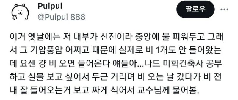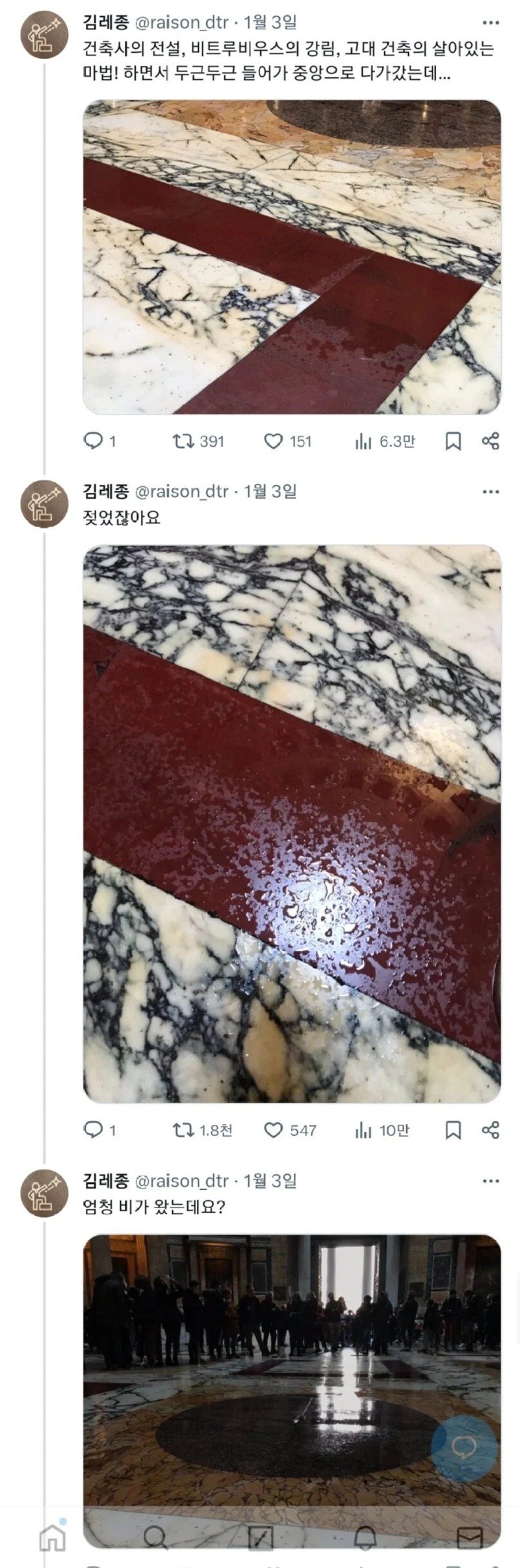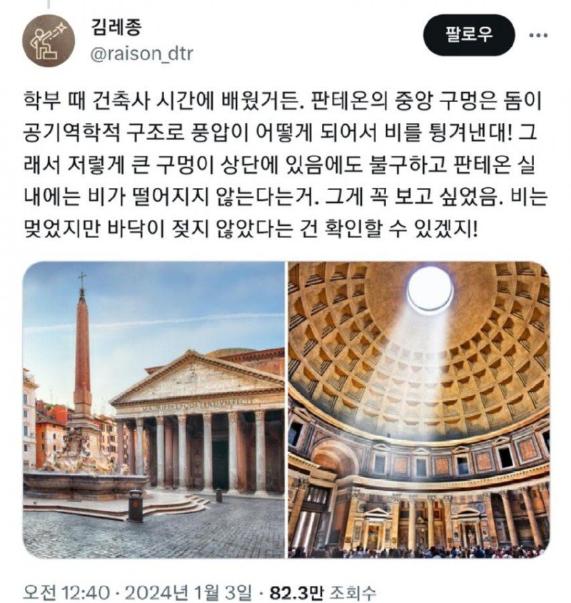 김레종 @raison_dtr가 팔로우를 하면서 학부 때 건축사 시간에 배운 지식을 나누고 있습니다. 건축물인 판테온의 중앙 구멍은 돔이 공기역학적 구조로 풍압이 어떻게 되어서 비를 튕겨냅니다. 그래서 비가 떨어지지 않는다는 것을 확인하고 싶은 욕구가 있었던 것 같습니다. 2024년 1월 3일에는 82.3만 명이 조회한 트윗을 남기며 판테온 내부의 비가 들어오지 않는 현상을 확인했습니다. 그 후에는 비 오는 날에도 직접 확인하러 가서 놀라움을 느끼고 교수님께 질문을 하며 자세히 알아보았습니다. 현재는 불을 피우지 않아도 되는 상황이지만 과거에는 중앙에 불을 피워야 했던 이야기도 함께 나누고 있습니다.