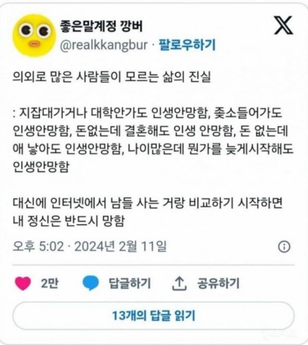 삶의 진리는 지잡대나 대학에 가지 않아도, 좋은 직업에 종사하지 않아도, 부자가 아니어도, 결혼을 하지 않아도, 자녀를 가지지 않아도, 나이가 많아도 늦은 시작을 해도 인생이 망하지 않는다는 것이다. 그러나 다른 사람들과 비교하며 자신의 삶을 평가하면 마음은 망가지게 된다. 온라인에서 다른 사람들의 삶을 보고 흔들리지 말고 자신의 길을 찾아가자.