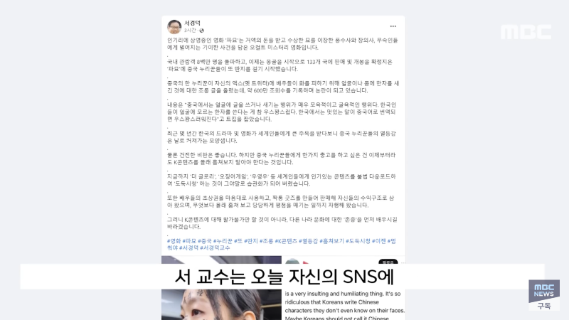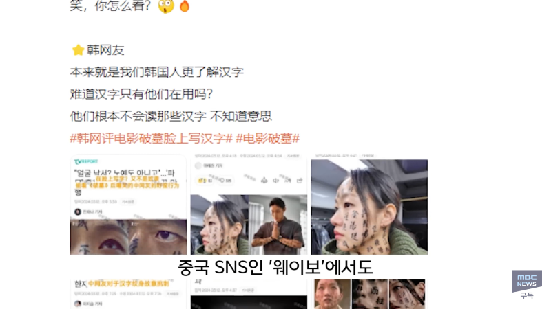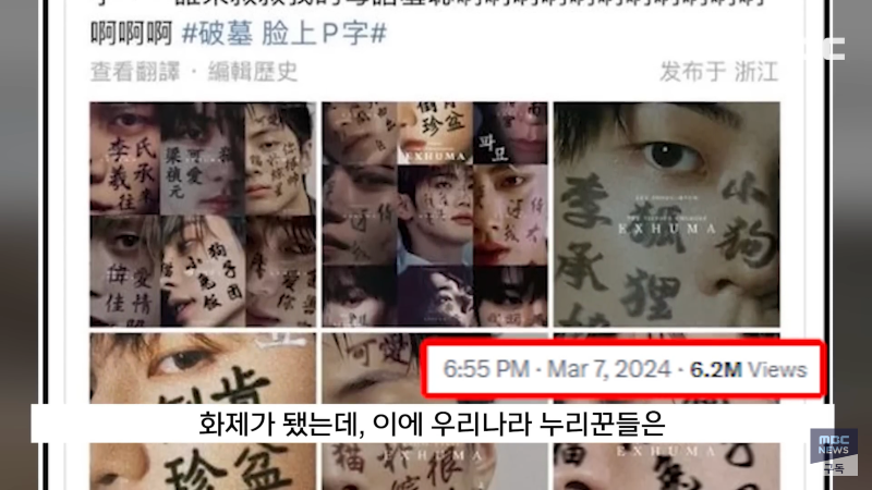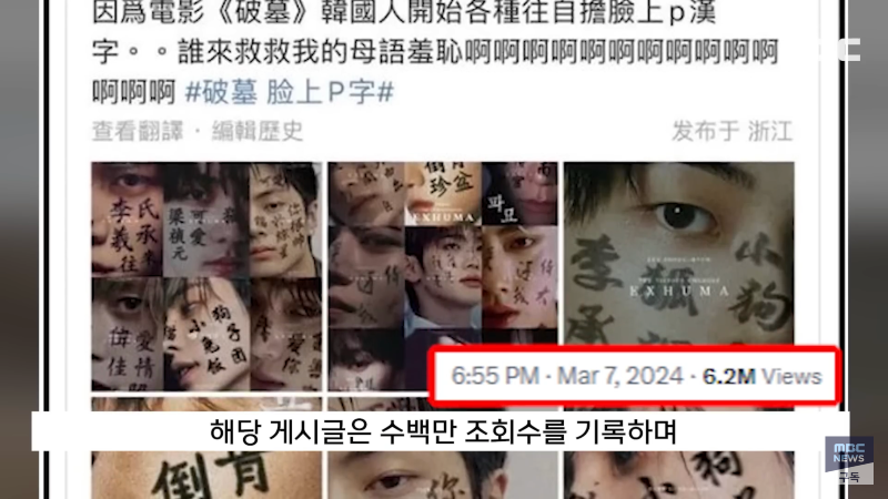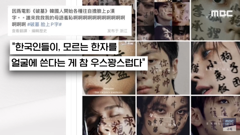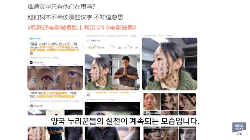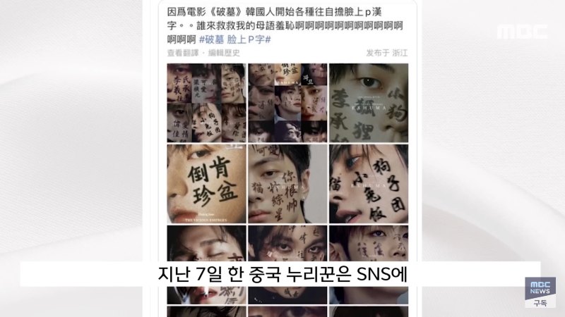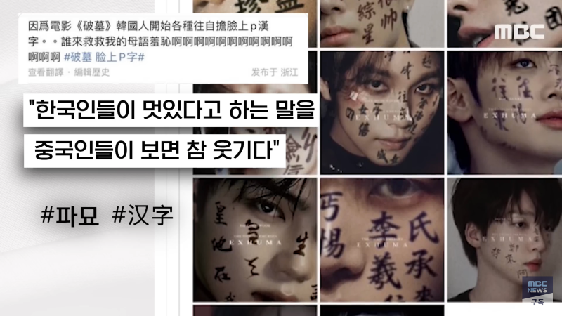 MBC 출처 쇼박스 영화 '파묘'가 이번 주 900만 관객 돌파에 도전 중입니다. 중국 누리꾼들이 영화 속 몇 가지 장면을 문제 삼으면서 논란이 일고 있습니다. 이에 한자를 얼굴에 쓴 한국인들을 비웃는 중국인들의 반응이 이목을 끌고 있습니다. 한국인들과 중국인들 간의 문화차이로 인한 갈등이 논란의 중심이 되고 있습니다. 관심이 끌리는 영화 '파묘'의 인기는 매우 높아 수백만 조회수를 기록하고 있습니다. 현재 논란이 계속 이어지고 있는 상황에서 어떻게 해결될지 주목된다.
