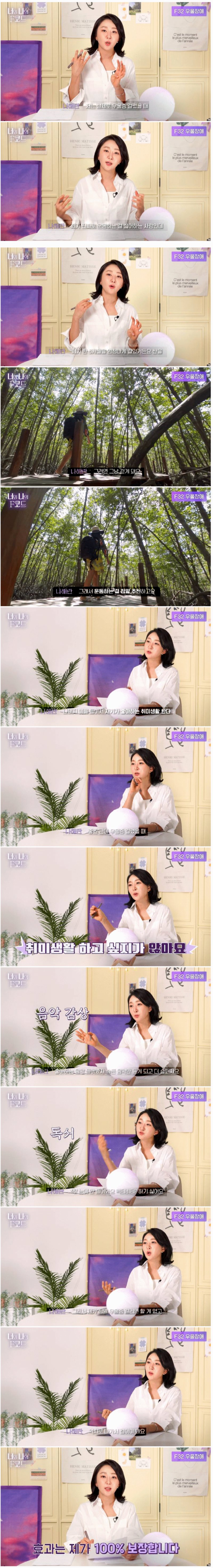 너와 나의 코드 HENRI MATISSE는 우울증에 걸렸을 때 운동을 극복하는 나의 코드입니다. 운동을 싫어하는 사람이지만 산을 걷는 것을 즐겨하는 나는 6개월간 엄청나게 노력했고 결과를 얻었습니다. 운동뿐만 아니라 나의 취미 생활도 중요하다. 우울증은 슬픔을 더하고 힘들게 만들지만, 좋아하는 음악을 듣고 책을 읽는 것도 도움이 된다. 억지로라도 밖으로 나가서 걷는 것이 중요하다. HENRI MATISSE의 작품과 같이 삶을 아름답게 채워보자.