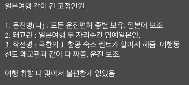 지난 여행에서 혼여 안한 이유는 운전병(나), 왜교관, 그리고 작전병이 함께 갔기 때문이었다. 운전병은 모든 운전면허를 가지고 있고, 일본어도 보조할 수 있다. 왜교관은 일본여행을 자주 가는 명예일본인이며, 작전병은 여행 계획 및 예약을 모두 해주고 여행을 선도해준다. 세 사람은 여행 취향이 비슷해서 불편한 점이 없었고, 한 명이 일본어를 잘하는 것만으로 편안한 여행이 가능했다. 우리는 모두 주특기와 부특기를 가지고 있어서 역할 분담이 원활했다. 계획을 싫어하는 나, 무면허인 왜교관, 일본어를 못하는 작전병이 상호보완하는 관계였다.세 명이 모두 완벽하게 맞아떨어져서 즐거운 일본 여행을 즐길 수 있었다.