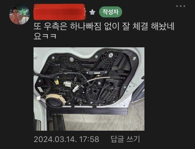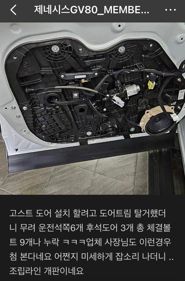 제네시스 GV80 멤버십, 자칭 프리미엄 제네시스의 마감 조립 수준이 채팅과 구독으로 알려져 있습니다. 고스트 도어를 설치하려고 도어 트림을 탈거했더니, 무려 운전석 쪽 6개와 후석 도어 3개 총 체결 볼트 9개가 누락되어 있는 것을 발견했습니다. 업체 사장님도 이러한 경우 처음 보신다고 하더군요. 어쩐지 미세하게 잡소리가 나더니 조립 라인이 개판인 것 같습니다. 처음부터 나사가 전혀 체결되지 않은 모습이 포착되었습니다. 우측은 하나도 빠짐없이 잘 체결되어 있는데, 이해할 수 없는 일입니다. 고스트 도어 작업을 시작하려면 뜯어봐야 하는데, 저런 상태로 계속해서 잡소리를 듣고 스트레스를 받으며 운행했던 것 같네요. 정말 끔찍한 상황이라고 생각됩니다. 그런 상태로 1억이라는 돈을 투자한 것은 참 아깝습니다.