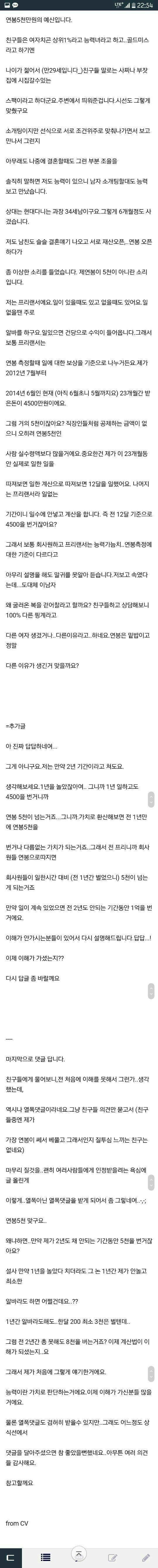 LTE+22:54 연봉 5천만원의 예신인데, 친구들이 능력녀라고 칭찬을 많이 해줘요. 나이가 어리지만 많은 사람들이 저를 인정해주고 소개팅을 통해 만나게 되었죠. 만29세인데 상대는 현대다니는 과장 34세 남자였어요. 서로 재산과 연봉에 대해 이야기를 나누었는데, 이상한 소리를 듣게 되었어요. 제 연봉은 프리랜서인데, 일에 따라 수입이 발생하고 보상을 받아 23개월간의 돈을 합해봤을 때 거의 5천이라고 생각했는데 상대는 이를 이해하지 못했어요. 설명을 해도 이해가 가지 않아 실망스러웠지만, 진짜 이유가 무엇일지 이해하고 싶을때 친구들과 상담하여 도움을 받았어요.생각보다 많은 이유가 있을 것이라고 생각해요.답답하고 솔직한 대화가 필요하다고 생각해요.