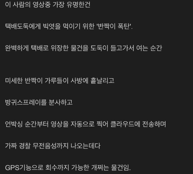 유명한 영상 중 하나는 '반짝이 폭탄'이라고 불리는 것으로, 택배도둑에게 함정을 설정하는 내용이다. 반짝이가루와 방귀스프레이 등이 내장된 택배가 도둑에게 전달되면, 영상이 자동으로 찍히고 GPS를 통해 위치를 추적하여 회수가 가능한 혁신적인 아이템이다.