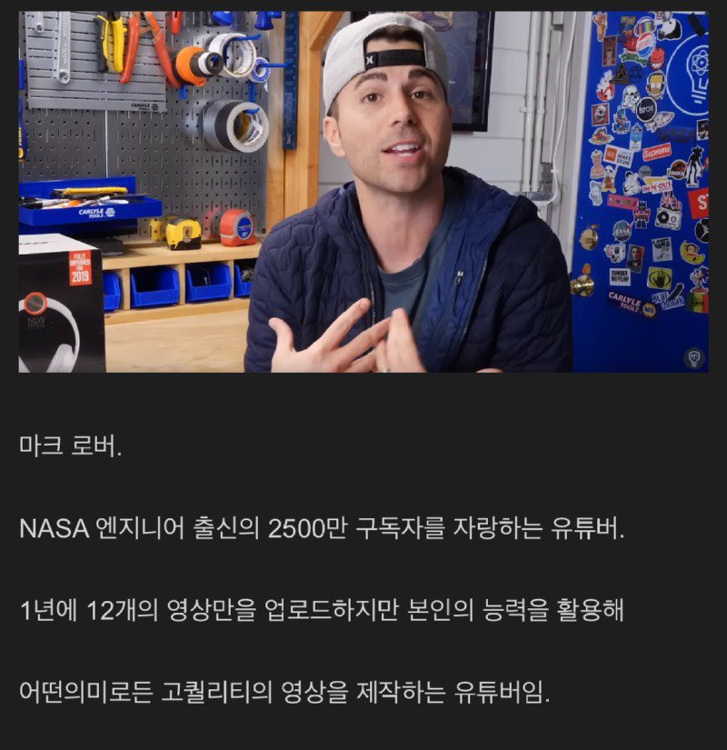 2019년에 출시된 캐럴 세삶 마크 로버는 NASA 엔지니어 출신으로, 2500만 구독자를 보유한 유튜버이다. 이 유튜버는 1년에 12개의 고품질 영상을 제작하여 업로드하며, 주로 TOOLS BUZZ700s EASING JUNK FOODANDOM ORT AND STOPAR MOUWE ACTOPLIC NOT ASTMEMS OF PEOP Lew ch KM08-08 V LI-ION BP #TEAMTREES SUNNY GOLD와 같은 장비를 활용한다.