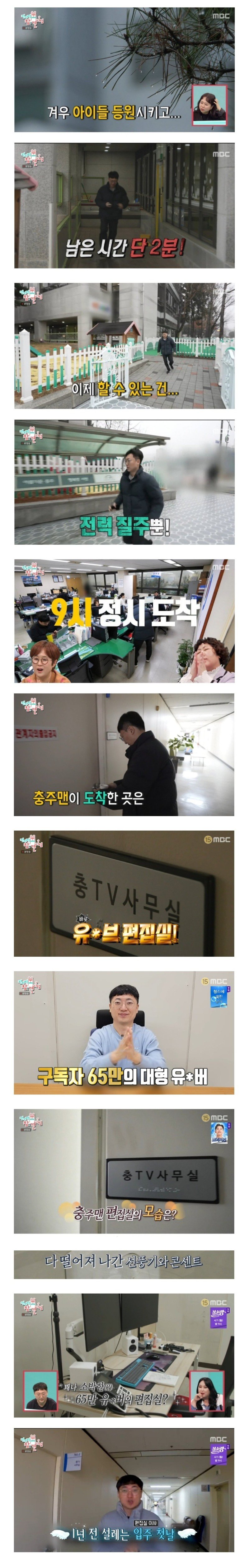 본방송 방송 관계자의 출입금지가 아이들을 등원시키고, 남은 시간은 단 2분! 이제 할 수 있는 건 전략질주뿐! 잠시 도착한 충주맨은 충 TV 사무실에서 유브 편집실으로 향했다. 65만 구독자를 가진 대형 유버 충 TV 사무실에서의 충주맨 편집실 모습은? 선풍기와 콘센트가 다 떨어져 나가고, 소박한(?) 65만 유비의 편집실이었다. 본방송 701-1의 편집실 이사 1년 전 설레는 입주 첫날, MBC 15에 나온 남자 15번 브라이언이 청소를 한다. 밤 9시에 MBC 청소과에서 엠뚜루 촬영을 준비하는데, 김선태 충주시 홍보맨(출연까지 할 땐) 촬영을 도와줄 사람이 없다. 충 중 유주문이 얼마인지 증빙을 요청하며, 나는솔로 유튜브 운영 예산이 62만원이라며 세금이나 낭비하지 않겠다고 말했다. 엠뚜루와 마뚜루, ATT와 현대차 생산직, 홍보맨의 자세를 토론하는 특집이 20분 후에 엠뚜루에서 방송된다.